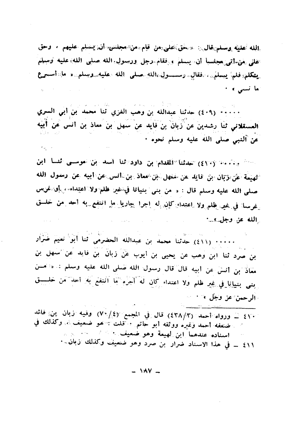 410 - حَدَّثَنَا الْمِقْدَامُ بْنُ دَاوُدَ، ثنا أَسَدُ بْنُ مُوسَى، ثنا ابْنُ لَهِيعَةَ، عَنْ زَبَّانَ بْنِ فَايِدٍ، عَنْ سَهْلِ بْنِ مُعَاذِ بْنِ أَنَسٍ، عَنْ أَبِيهِ، عَنْ رَسُولِ اللهِ صَلَّى اللهُ عَلَيْهِ وَسَلَّمَ قَالَ: «§مَنْ بَنَى بُنْيَانًا فِي غَيْرِ ظُلْمٍ وَلَا اعْتِدَاءٍ، أَوْ غَرَسَ غَرْسًا فِي غَيْرِ ظُلْمٍ وَلَا اعْتِدَاءٍ كَانَ لَهُ أَجْرًا جَارِيًا مَا انْتَفَعَ بِهِ أَحَدٌ مِنْ خَلْقِ اللهِ عَزَّ وَجَلَّ»