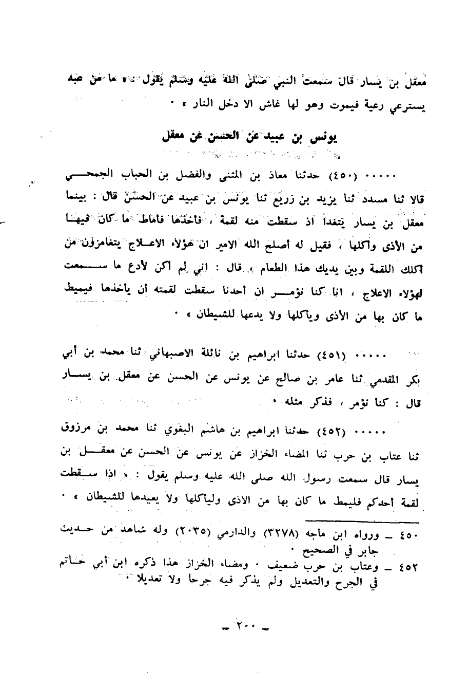 450 - حَدَّثَنَا مُعَاذُ بْنُ الْمُثَنَّى، وَالْفَضْلُ بْنُ الْحُبَابِ الْجُمَحِيُّ، قَالَا: ثنا مُسَدَّدٌ، ثنا يَزِيدُ بْنُ زُرَيْعٍ، ثنا يُونُسُ بْنُ عُبَيْدٍ، عَنِ الْحَسَنِ، قَالَ: بَيْنَمَا مَعْقِلُ بْنُ يَسَارٍ يَتَغَدَّى إِذْ سَقَطَتْ مِنْهُ لُقْمَةٌ، فَأَخَذَهَا فَأَمَاطَ مَا كَانَ فِيهَا مِنَ الْأَذَى وَأَكَلَهَا، فَقِيلَ لَهُ: أَصْلِحَ اللهُ الْأَمِيرَ، إِنَّ هَؤُلَاءِ الْأَعْلَاجَ يَتَغَامَزُونَ مِنْ أَكْلِكَ اللُّقْمَةَ، وَبَيْنَ يَدَيْكَ هَذَا الطَّعَامُ، قَالَ: «إِنِّي لَمْ أَكُنْ لِأَدَعَ مَا سَمِعْتُ لِهَؤُلَاءِ الْأَعْلَاجِ، إِنَّا كُنَّا §نُؤْمَرُ إِنْ أَحَدُنَا سَقَطَتْ لُقْمَتُهُ أَنْ يَأْخُذَهَا فَيُمِيطَ مَا كَانَ بِهَا مِنَ الْأَذَى وَيَأْكُلَهَا وَلَا يَدَعَهَا لِلشَّيْطَانِ»