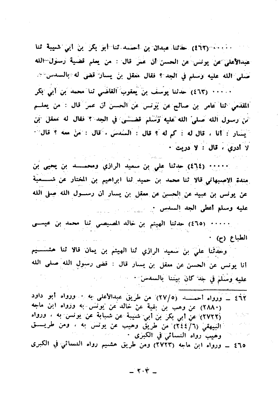 465 - حَدَّثَنَا الْهَيْثَمُ بْنُ خَالِدٍ الْمِصِّيصِيُّ، ثنا مُحَمَّدُ بْنُ عِيسَى الطَّبَّاعُ، ح وَحَدَّثَنَا عَلِيُّ بْنُ سَعِيدٍ الرَّزِايُّ، ثنا الْهَيْثَمُ بْنُ يَمَانٍ قَالَا: ثنا هُشَيْمٌ، أَنَا يُونُسُ، عَنِ الْحَسَنِ، عَنْ مَعْقِلِ بْنِ يَسَارٍ قَالَ: «§قَضَى رَسُولُ اللهِ صَلَّى اللهُ عَلَيْهِ وَسَلَّمَ فِي جَدٍّ كَانَ بَيْنَنَا بِالسُّدُسِ»