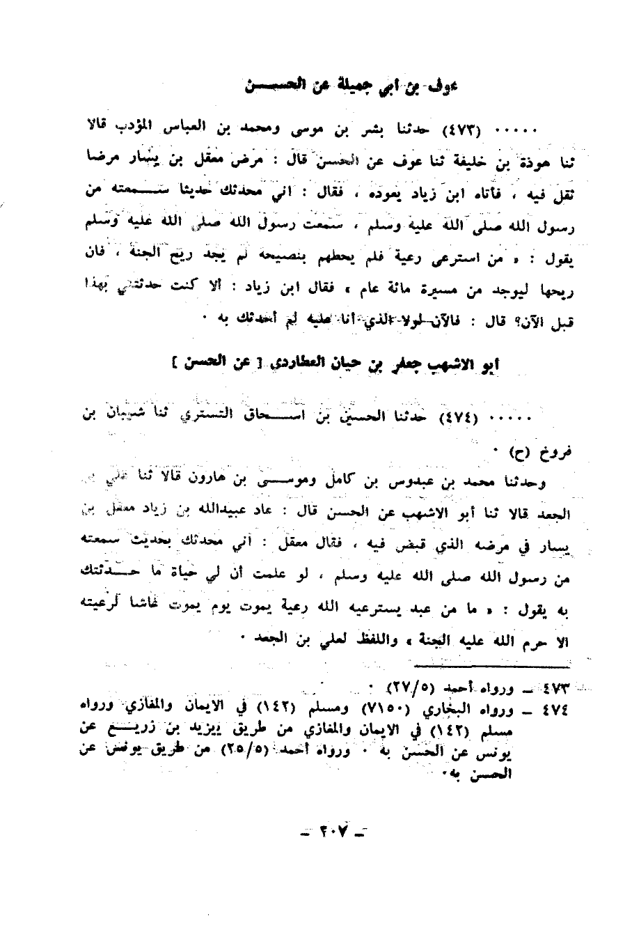 474 - حَدَّثَنَا الْحُسَيْنُ بْنُ إِسْحَاقَ التُّسْتَرِيُّ، ثنا شَيْبَانُ بْنُ فَرُّوخٍ، ح وَحَدَّثَنَا مُحَمَّدُ بْنُ عَبْدُوسِ بْنِ كَامِلٍ، وَمُوسَى بْنُ هَارُونَ، قَالَا: ثنا عَلِيُّ بْنُ الْجَعْدِ، قَالَا: ثنا أَبُو الْأَشْهَبِ، عَنِ الْحَسَنِ، قَالَ: عَادَ عُبَيْدُ اللهِ بْنُ زِيَادٍ مَعْقِلَ بْنَ يَسَارٍ فِي مَرَضِهِ الَّذِي قُبِضَ فِيهِ، فَقَالَ مَعْقِلٌ: إِنِّي مُحَدِّثُكَ بِحَدِيثٍ سَمِعْتُهُ مِنْ رَسُولِ اللهِ صَلَّى اللهُ عَلَيْهِ وَسَلَّمَ، لَوْ عَلِمْتُ أَنَّ لِي حَيَاةً مَا حَدَّثْتُكَ بِهِ، سَمِعْتُهُ يَقُولُ: «§مَا مِنْ عَبْدٍ يَسْتَرْعِيهِ اللهُ رَعِيَّةً يَمُوتُ يَوْمَ يَمُوتُ غَاشًّا لِرَعِيَّتِهِ إِلَّا حَرَّمَ اللهُ عَلَيْهِ الْجَنَّةَ» وَاللَّفْظُ لِعَلِيِّ بْنِ الْجَعْدِ
