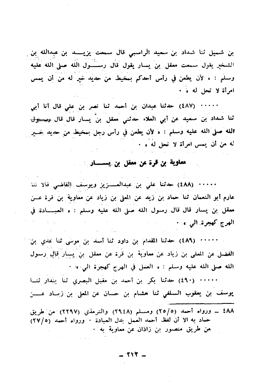 488 - حَدَّثَنَا عَلِيُّ بْنُ عَبْدِ الْعَزِيزِ، وَيُوسُفُ الْقَاضِي، قَالَا: ثنا عَارِمٌ أَبُو النُّعْمَانِ، ثنا حَمَّادُ بْنُ زَيْدٍ، عَنِ الْمُعَلَّى بْنِ زِيَادٍ، عَنْ مُعَاوِيَةَ بْنِ قُرَّةَ، عَنْ مَعْقِلِ بْنِ يَسَارٍ قَالَ: قَالَ رَسُولُ اللهِ صَلَّى اللهُ عَلَيْهِ وَسَلَّمَ: «§الْعِبَادَةُ فِي الْهَرْجِ كَهِجْرَةٍ إِلَيَّ»