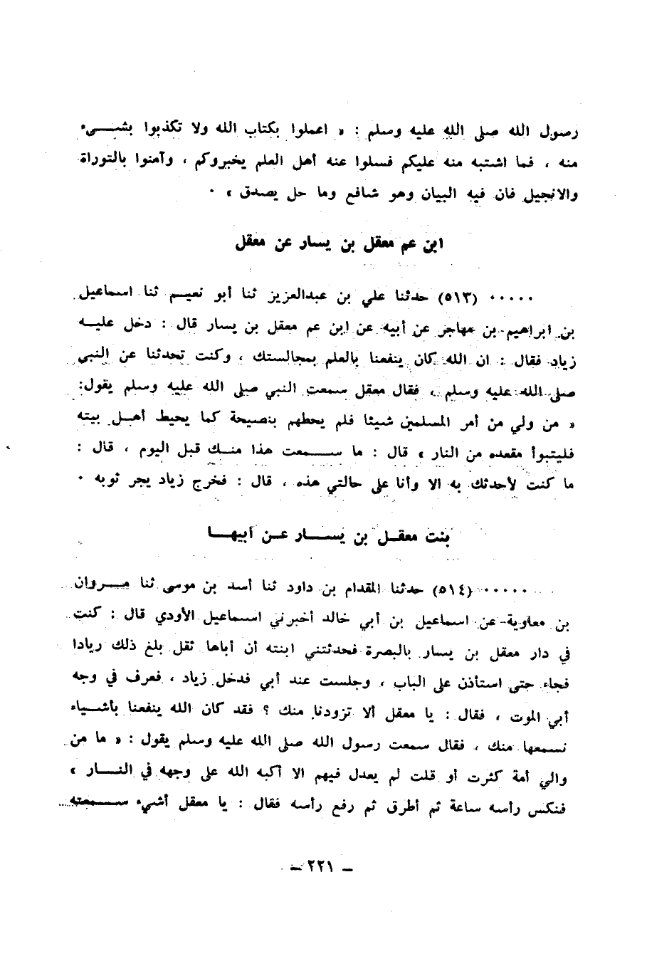 514 - حَدَّثَنَا الْمِقْدَامُ بْنُ دَاوُدَ، ثنا أَسَدُ بْنُ مُوسَى، ثنا مَرْوَانُ بْنُ مُعَاوِيَةَ، عَنْ إِسْمَاعِيلَ بْنِ أَبِي خَالِدٍ، أَخْبَرَنِي إِسْمَاعِيلُ الْأَوْدِيُّ، قَالَ: كُنْتُ فِي دَارِ مَعْقِلِ بْنِ يَسَارٍ بِالْبَصْرَةِ، فَحَدَّثَتْنِي ابْنَتُهُ أَنَّ أَبَاهَا لَمَّا ثَقُلَ بَلَغَ ذَلِكَ زِيَادًا، فَجَاءَ حَتَّى اسْتَأْذَنَ عَلَى الْبَابِ، وَجَلَسْتُ عِنْدَ أَبِي فَدَخَلَ زِيَادٌ فَعَرَفَ فِي وَجْهِ أَبِي الْمَوْتَ، فَقَالَ: يَا مَعْقِلُ، أَلَا تُزَوِّدُنَا مِنْكَ؟ فَقَدْ كَانَ اللهُ يَنْفَعُنَا بِأَشْيَاءَ نَسْمَعُهَا مِنْكَ، فَقَالَ لَهُ: سَمِعْتُ رَسُولَ اللهِ صَلَّى اللهُ عَلَيْهِ وَسَلَّمَ يَقُولُ: «§مَا مِنْ وَالِي أُمَّةٍ كَثُرَتْ أَوْ قَلَّتْ لَمْ يَعْدِلْ فِيهِمْ إِلَّا أَكَبَّهُ اللهُ عَلَى وَجْهِهِ فِي النَّارِ» فَنَكَّسَ رَأْسَهُ سَاعَةً ثُمَّ أَطْرَقَ، ثُمَّ رَفَعَ رَأْسَهُ فَقَالَ: يَا مَعْقِلُ، أَشَيْءٌ سَمِعْتَهُ مِنْ رَسُولِ اللهِ صَلَّى اللهُ عَلَيْهِ وَسَلَّمَ؟ أُمْ مِنْ وَرَاءَ وَرَاءَ؟ فَقَالَ: بَلْ سَمِعْتُهُ مِنْ رَسُولِ اللهِ صَلَّى اللهُ عَلَيْهِ وَسَلَّمَ