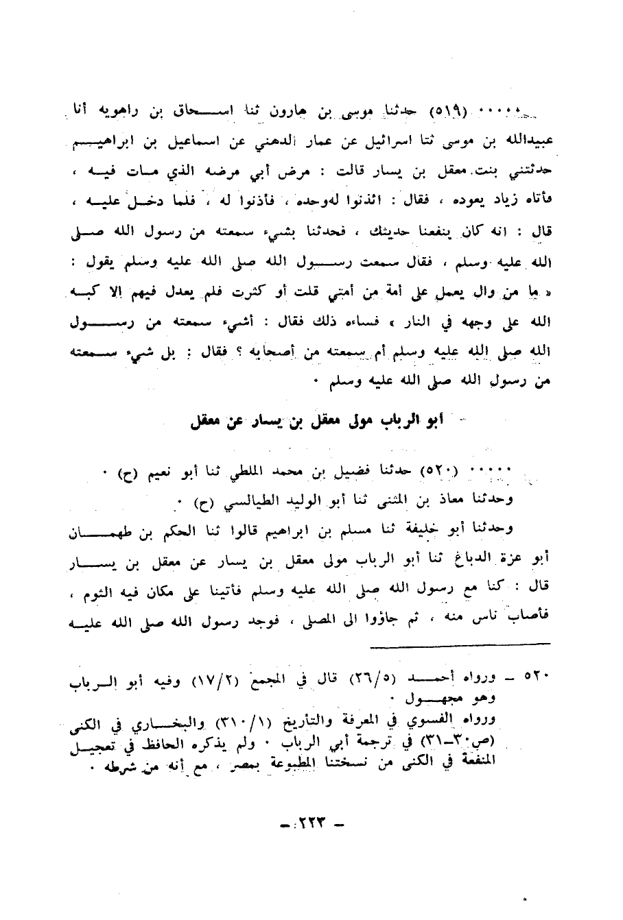 519 - حَدَّثَنَا مُوسَى بْنُ هَارُونَ، ثنا إِسْحَاقُ بْنُ رَاهَوَيْهِ، أَنَا عُبَيْدُ اللهِ بْنُ مُوسَى، ثنا إِسْرَائِيلُ، عَنْ عَمَّارٍ الدُّهْنِيِّ، عَنْ إِسْمَاعِيلَ بْنِ إِبْرَاهِيمَ، حَدَّثَتْنِي بِنْتُ مَعْقِلِ بْنِ يَسَارٍ، قَالَتْ: مَرِضَ أَبِي مَرَضَهُ الَّذِي مَاتَ فِيهِ، فَأَتَاهُ زِيَادٌ يَعُودُهُ، فَقَالَ: ائْذَنُوا لَهُ وَحْدَهُ، فَأَذِنُوا لَهُ، فَلَمَّا دَخَلَ عَلَيْهِ قَالَ: إِنَّهُ كَانَ يَنْفَعُنَا حَدِيثُكَ فَحَدِّثْنَا بِشَيْءٍ سَمِعْتَهُ مِنْ رَسُولِ اللهِ صَلَّى اللهُ عَلَيْهِ وَسَلَّمَ، فَقَالَ: سَمِعْتُ رَسُولَ اللهِ صَلَّى اللهُ عَلَيْهِ وَسَلَّمَ يَقُولُ: «§مَا مِنْ وَالٍ يَعْمَلُ عَلَى أُمَّةٍ مِنْ أُمَّتِي قَلَّتْ أَوْ كَثُرَتْ، فَلَمْ يَعْدِلْ فِيهِمْ إِلَّا كَبَّهُ اللهُ عَلَى وَجْهِهِ فِي النَّارِ» فَسَاءَهُ ذَلِكَ فَقَالَ: أَشَيْءٌ سَمِعْتَهُ مِنْ رَسُولِ اللهِ صَلَّى اللهُ عَلَيْهِ وَسَلَّمَ أَمْ سَمِعْتَهُ مِنْ أَصْحَابِهِ؟ فَقَالَ: بَلْ شَيْءٌ سَمِعْتُهُ مِنْ رَسُولِ اللهِ صَلَّى اللهُ عَلَيْهِ وَسَلَّمَ
