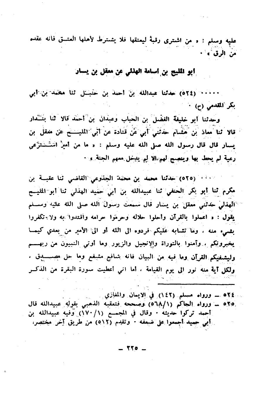 524 - حَدَّثَنَا عَبْدُ اللهِ بْنُ أَحْمَدَ بْنِ حَنْبَلٍ، ثنا مُحَمَّدُ بْنُ أَبِي بَكْرٍ الْمُقَدَّمِيُّ، ح وَحَدَّثَنَا أَبُو خَلِيفَةَ الْفَضْلُ بْنُ الْحُبَابِ، وَعَبْدَانُ بْنُ أَحْمَدَ، قَالَا: ثنا بُنْدَارٌ قَالَا: ثنا مُعَاذُ بْنُ هِشَامٍ، حَدَّثَنِي أَبِي، عَنْ قَتَادَةَ، عَنْ أَبِي الْمَلِيحِ، عَنْ مَعْقِلِ بْنِ يَسَارٍ، قَالَ: قَالَ رَسُولُ اللهِ صَلَّى اللهُ عَلَيْهِ وَسَلَّمَ: «§مَا مِنْ أَمِيرٍ اسْتُرْعِيَ رَعِيَّةً لَمْ يُحِطْ بِهَا، وَيَنْصَحْ لَهُمْ إِلَّا لَمْ يَدْخُلْ مَعَهُمُ الْجَنَّةَ»