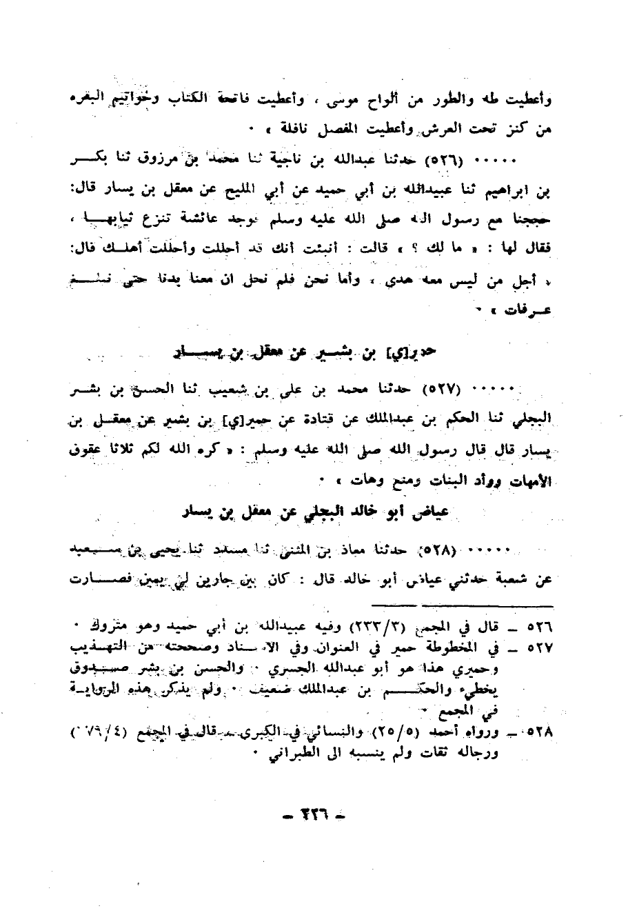 526 - حَدَّثَنَا عَبْدُ اللهِ بْنُ نَاجِيَةَ، ثنا مُحَمَّدُ بْنُ مَرْزُوقٍ، ثنا بَكْرُ بْنُ إِبْرَاهِيمَ، ثنا عُبَيْدُ اللهِ بْنُ أَبِي حُمَيْدٍ، عَنْ أَبِي الْمَلِيحِ، عَنْ مَعْقِلِ بْنِ يَسَارٍ، قَالَ: حَجَجْنَا مَعَ رَسُولِ اللهِ صَلَّى اللهُ عَلَيْهِ وَسَلَّمَ فَوَجَدَ عَائِشَةَ تَنْزِعُ ثِيَابَهَا، فَقَالَ لَهَا: «مَا لَكِ؟» قَالَتْ: أُنْبِئْتُ أَنَّكَ قَدْ أَحْلَلْتَ وَأَحْلَلْتَ أَهْلَكَ، قَالَ: «أَجَلْ، §مَنْ لَيْسَ مَعَهُ هَدْيٌ، وَأَمَّا نَحْنُ فَلَمْ نَحِلَّ، إِنَّ مَعَنَا بُدْنًا حَتَّى نَبْلُغَ عَرَفَاتٍ»