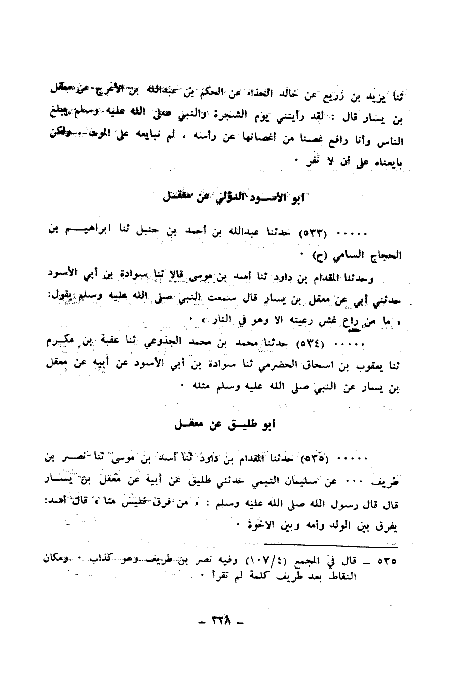 535 - حَدَّثَنَا الْمِقْدَامُ بْنُ دَاوُدَ، ثنا أَسَدُ بْنُ مُوسَى، ثنا نَصْرُ بْنُ طَرِيفٍ، عَنْ سُلَيْمَانَ التَّيْمِيِّ، حَدَّثَنِي طَلِيقٌ، عَنْ أَبِيهِ، عَنْ مَعْقِلِ بْنِ يَسَارٍ، قَالَ: قَالَ رَسُولُ اللهِ صَلَّى اللهُ عَلَيْهِ وَسَلَّمَ: «§مَنْ فَرَّقَ فَلَيْسَ مِنَّا» قَالَ أَسَدٌ: «يُفَرِّقُ بَيْنَ الْوَلَدِ وَأُمِّهِ وَبَيْنَ الْإِخْوَةِ»