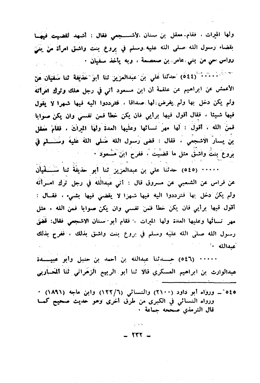 545 - حَدَّثَنَا عَلِيُّ بْنُ عَبْدِ الْعَزِيزِ، ثنا أَبُو حُذَيْفَةَ، ثنا سُفْيَانُ، عَنْ فِرَاسٍ، عَنِ الشَّعْبِيِّ، عَنْ مَسْرُوقٍ، قَالَ: أُتِيَ عَبْدُ اللهِ فِي رَجُلٍ تَرَكَ امْرَأَتَهُ وَلَمْ يَكُنْ دَخَلَ بِهَا، فَتَرَدَّدُوا إِلَيْهِ فِيهَا شَهْرًا لَا يَقْضِي فِيهَا بِشَيْءٍ، فَقَالَ: أَقُولُ فِيهَا بِرَأْيِي، فَإِنْ يَكُنْ خَطَأً فَمِنْ نَفْسِي، وَإِنْ يَكُنْ صَوَابًا فَمِنَ اللهِ، «§مِثْلُ مَهْرِ نِسَائِهَا، وَعَلَيْهَا الْعِدَّةُ، وَلَهَا الْمِيرَاثُ» ، فَقَامَ أَبُو سِنَانٍ الْأَشْجَعِيُّ فَقَالَ: «قَضَى رَسُولُ اللهِ صَلَّى اللهُ عَلَيْهِ وَسَلَّمَ فِي بَرْوَعَ بِنْتِ وَاشِقٍ بِذَلِكَ» فَفَرِحَ بِذَلِكَ عَبْدُ اللهِ