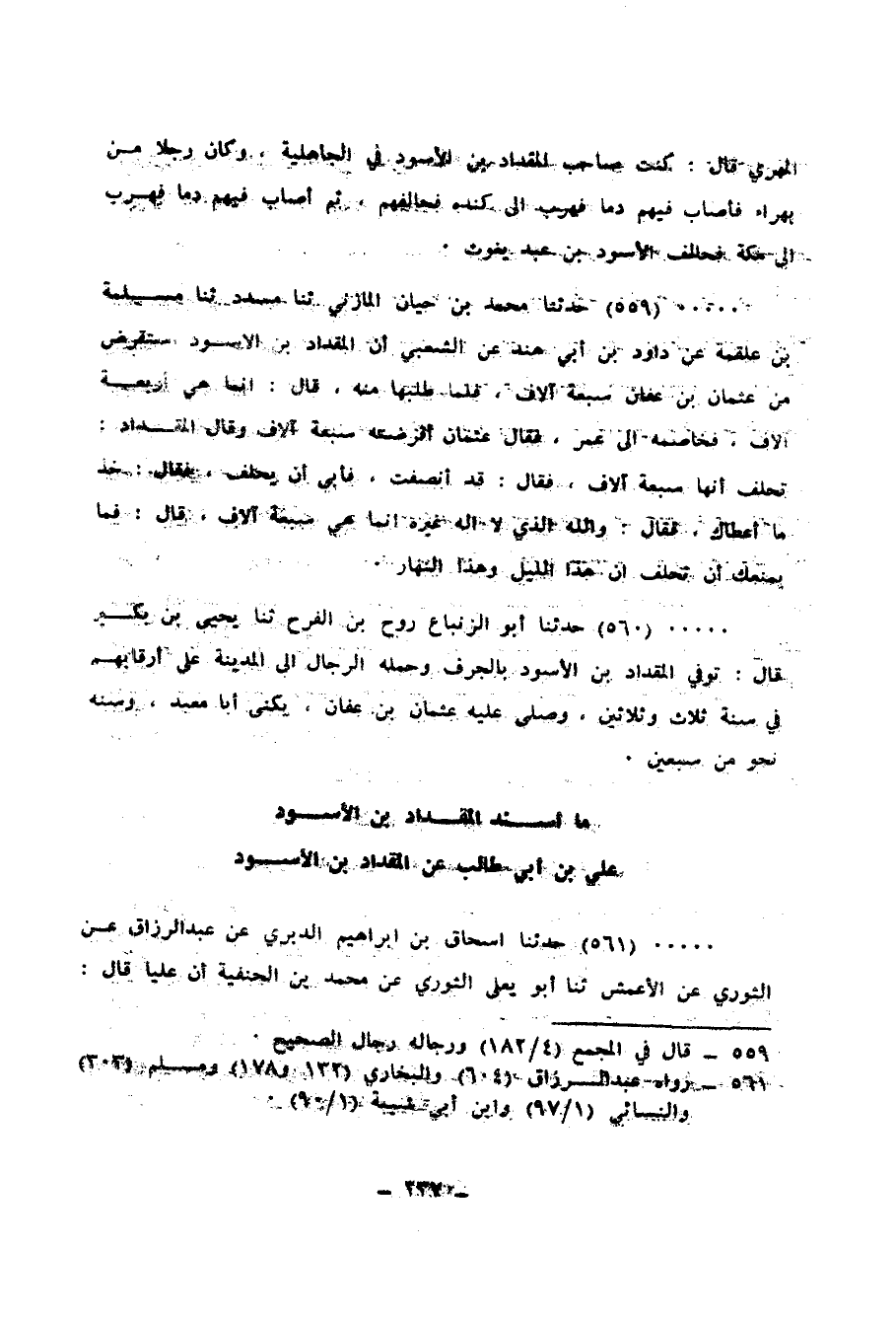 560 - حَدَّثَنَا أَبُو الزِّنْبَاعِ رَوْحُ بْنُ الْفَرَجِ، ثنا يَحْيَى بْنُ بُكَيْرٍ قَالَ: «§تُوُفِّيَ الْمِقْدَادُ بْنُ الْأَسْوَدِ بِالْجُرُفِ، وَحَمَلَهُ الرِّجَالُ إِلَى الْمَدِينَةِ عَلَى أَرْقَابِهِمْ فِي سَنَةِ ثَلَاثٍ وَثَلَاثِينَ، وَصَلَّى عَلَيْهِ عُثْمَانُ بْنُ عَفَّانَ، يُكْنَى أَبَا مَعْبَدٍ وَسِنُّهُ نَحْوٌ مِنْ سَبْعِينَ»