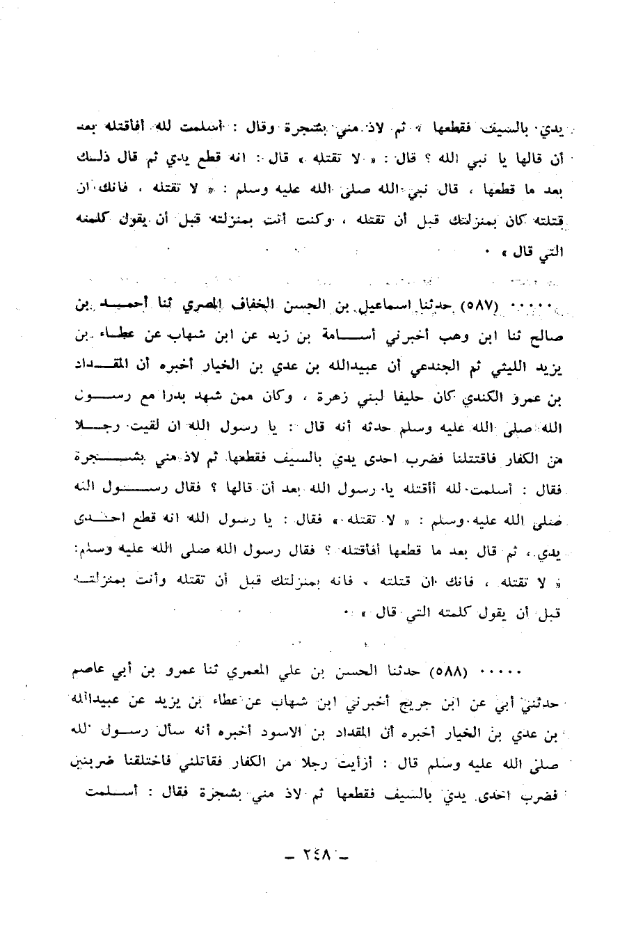 587 - حَدَّثَنَا إِسْمَاعِيلُ بْنُ الْحَسَنِ الْخَفَّافُ الْمِصْرِيُّ، ثنا أَحْمَدُ بْنُ صَالِحٍ، ثنا ابْنُ وَهْبٍ، أَخْبَرَنِي أُسَامَةُ بْنُ زَيْدٍ، عَنِ ابْنِ شِهَابٍ، عَنْ عَطَاءِ بْنِ يَزِيدَ اللَّيْثِيِّ ثُمَّ الْجُنْدَعِيِّ، أَنَّ عُبَيْدَ اللهِ بْنَ عَدِيِّ بْنِ الْخِيَارِ أَخْبَرَهُ، أَنَّ الْمِقْدَادَ بْنَ عَمْرٍو الْكِنْدِيَّ - كَانَ حَلِيفًا لِبَنِي زُهْرَةَ، وَكَانَ مِمَّنْ شَهِدَ بَدْرًا مَعَ رَسُولِ اللهِ صَلَّى اللهُ عَلَيْهِ وَسَلَّمَ - حَدَّثَهُ أَنَّهُ قَالَ: يَا رَسُولَ اللهِ، إِنْ لَقِيتُ رَجُلًا مِنَ الْكُفَّارِ فَاقْتَتَلْنَا فَضَرَبَ إِحْدَى يَدَيَّ بِالسَّيْفِ فَقَطَعَهَا ثُمَّ لَاذَ مِنِّي بِشَجَرَةٍ، فَقَالَ: أَسْلَمْتُ لِلَّهِ، أَأَقْتُلُهُ يَا رَسُولَ اللهِ بَعْدَ أَنْ قَالَهَا؟ فَقَالَ رَسُولُ اللهِ صَلَّى اللهُ عَلَيْهِ وَسَلَّمَ: «لَا تَقْتُلْهُ» ، فَقَالَ: يَا رَسُولَ اللهِ إِنَّهُ قَطَعَ إِحْدَى يَدَيَّ، ثُمَّ قَالَ بَعْدَ مَا قَطَعَهَا أَفَأَقْتُلُهُ؟ فَقَالَ رَسُولُ اللهِ صَلَّى اللهُ عَلَيْهِ وَسَلَّمَ: «لَا تَقْتُلْهُ، فَإِنَّكَ» §إِنْ قَتَلْتَهُ، فَإِنَّهُ بِمَنْزِلَتِكَ قَبْلَ أَنْ تَقْتُلَهُ، وَأَنْتَ بِمَنْزِلَتِهِ قَبْلَ أَنْ يَقُولَ كَلِمَتَهُ الَّتِي قَالَ "
