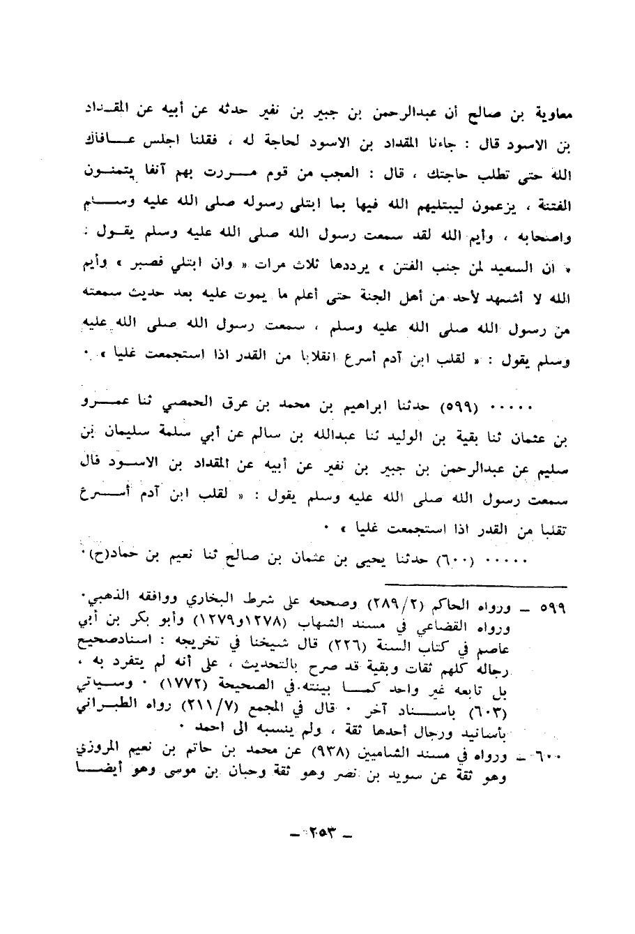 599 - حَدَّثَنَا إِبْرَاهِيمُ بْنُ مُحَمَّدِ بْنِ عِرْقٍ الْحِمْصِيُّ، ثنا عَمْرُو بْنُ عُثْمَانَ، ثنا بَقِيَّةُ بْنُ الْوَلِيدِ، ثنا عَبْدُ اللهِ بْنُ سَالِمٍ، عَنْ أَبِي سَلَمَةَ سُلَيْمَانَ بْنِ سُلَيْمٍ، عَنْ عَبْدِ الرَّحْمَنِ بْنِ جُبَيْرِ بْنِ نُفَيْرٍ، عَنْ أَبِيهِ، عَنِ الْمِقْدَادِ بْنِ الْأَسْوَدِ قَالَ: سَمِعْتُ رَسُولَ اللهِ صَلَّى اللهُ عَلَيْهِ وَسَلَّمَ يَقُولُ: «§لَقَلْبُ ابْنِ آدَمَ أَسْرَعُ تَقَلُّبًا مِنَ الْقِدْرِ إِذَا اسْتَجْمَعَتْ غَلْيًا»