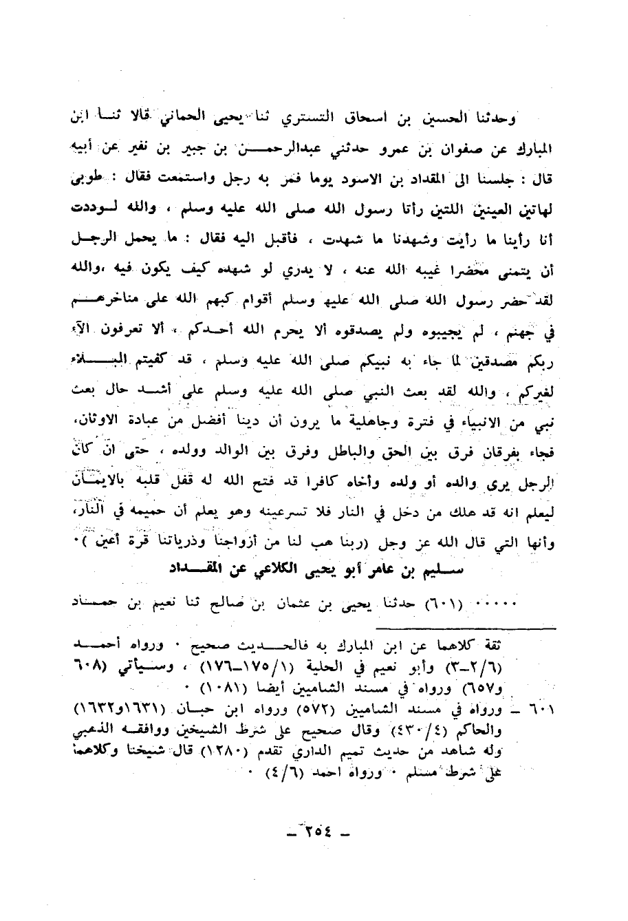 601 - حَدَّثَنَا يَحْيَى بْنُ عُثْمَانَ بْنِ صَالِحٍ، ثنا نُعَيْمُ بْنُ حَمَّادٍ، ثنا الْوَلِيدُ بْنُ مُسْلِمٍ، عَنْ عَبْدِ الرَّحْمَنِ بْنِ يَزِيدَ بْنِ جَابِرٍ، أَنَّهُ سَمِعَ سُلَيْمَ بْنَ عَامِرٍ يُحَدِّثُ، أَنَّهُ سَمِعَ الْمِقْدَادَ بْنَ الْأَسْوَدِ يَقُولُ: سَمِعْتُ رَسُولَ اللهِ صَلَّى اللهُ عَلَيْهِ وَسَلَّمَ يَقُولُ: «§لَا يَبْقَى عَلَى وَجْهِ الْأَرْضِ بَيْتُ مَدَرٍ، وَلَا وَبِرٍ إِلَّا أَدْخَلَ اللهُ عَلَيْهِمُ الْإِسْلَامَ بِعِزِّ عَزِيزٍ وَبِذُلِّ ذَلِيلٍ، إِمَّا يُعِزُّهُمْ وَيَهْدِيهِمْ إِلَى الْإِسْلَامِ، وَإِمَّا يُذِلُّهُمْ فَيُؤَدُّوا الْجِزْيَةَ»