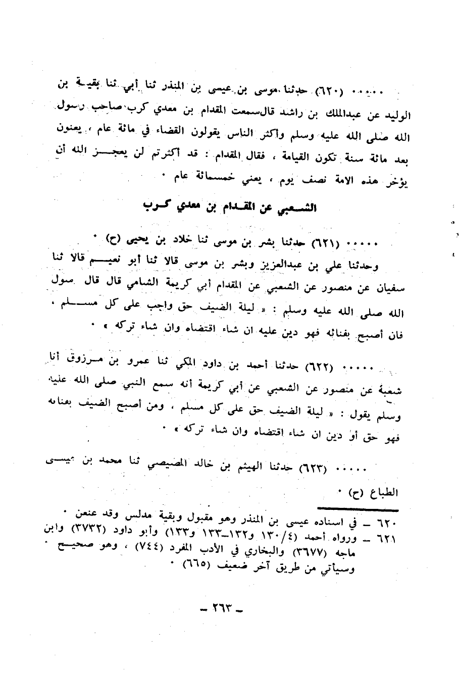 621 - حَدَّثَنَا بِشْرُ بْنُ مُوسَى، ثنا خَلَّادُ بْنُ يَحْيَى، ح وَحَدَّثَنَا عَلِيُّ بْنُ عَبْدِ الْعَزِيزِ، وَبِشْرُ بْنُ مُوسَى قَالَا: ثنا أَبُو نُعَيْمٍ، قَالَا: ثنا سُفْيَانُ، عَنْ مَنْصُورٍ، عَنِ الشَّعْبِيِّ، عَنِ الْمِقْدَامِ أَبِي كَرِيمَةَ الشَّامِيِّ، قَالَ: قَالَ رَسُولُ اللهِ صَلَّى اللهُ عَلَيْهِ وَسَلَّمَ: «§لَيْلَةُ الضَّيْفِ حَقٌّ وَاجِبٌ عَلَى كُلِّ مُسْلِمٍ، فَإِنْ أَصْبَحَ بِفِنَائِهِ فَهُوَ دَيْنٌ عَلَيْهِ، إِنْ شَاءَ اقْتَضَاهُ، وَإِنْ شَاءَ تَرَكَهُ»