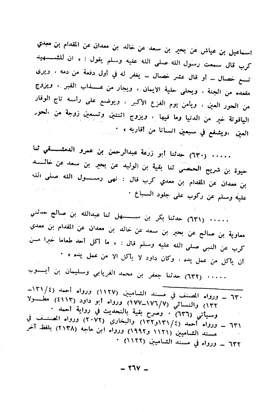 631 - حَدَّثَنَا بَكْرُ بْنُ سَهْلٍ، ثنا عَبْدُ اللهِ بْنُ صَالِحٍ، حَدَّثَنِي مُعَاوِيَةُ بْنُ صَالِحٍ، عَنْ بَحِيرِ بْنِ سَعْدٍ، عَنْ خَالِدِ بْنِ مَعْدَانَ، عَنِ الْمِقْدَامِ بْنِ مَعْدِي كَرِبٍ، عَنِ النَّبِيِّ صَلَّى اللهُ عَلَيْهِ وَسَلَّمَ قَالَ: «§مَا أَكَلَ أَحَدٌ طَعَامًا خَيْرًا مِنْ أَنْ يَأْكُلَ مِنْ عَمِلِ يَدِهِ، وَكَانَ دَاوُدُ لَا يَأْكُلُ إِلَّا مِنْ عَمِلِ يَدِهِ»