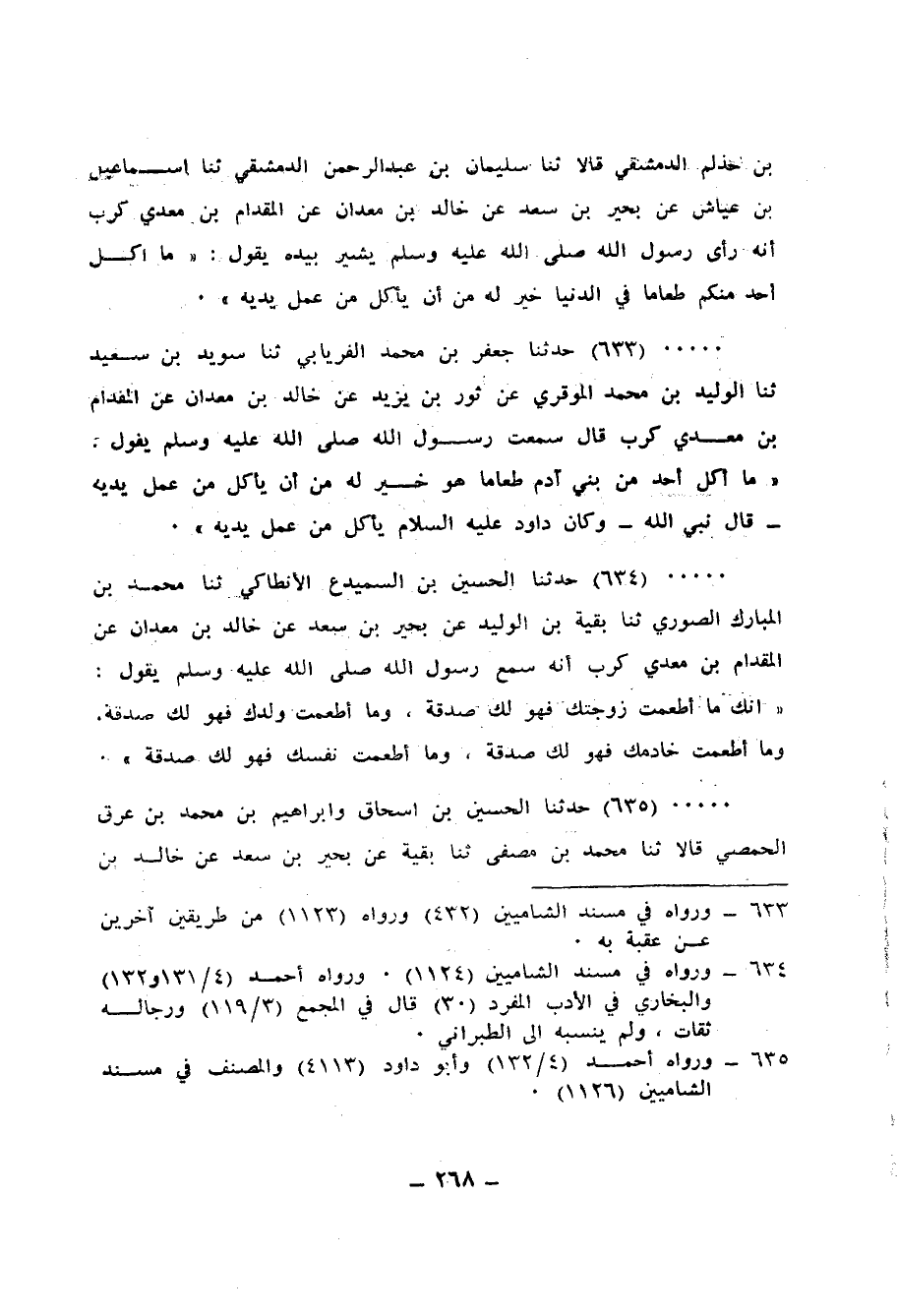 634 - حَدَّثَنَا الْحُسَيْنُ بْنُ السَّمَيْدَعِ الْأَنْطَاكِيُّ، ثنا مُحَمَّدُ بْنُ الْمُبَارَكِ الصُّورِيُّ، ثنا بَقِيَّةُ بْنُ الْوَلِيدِ، عَنْ بَحِيرِ بْنِ سَعْدٍ، عَنْ خَالِدِ بْنِ مَعْدَانَ، عَنِ الْمِقْدَامِ بْنِ مَعْدِي كَرِبٍ، أَنَّهُ سَمِعَ رَسُولَ اللهِ صَلَّى اللهُ عَلَيْهِ وَسَلَّمَ يَقُولُ: «§إِنَّكَ مَا أَطْعَمْتَ زَوْجَتَكَ فَهُوَ لَكَ صَدَقَةٌ، وَمَا أَطْعَمْتَ وَلَدَكَ فَهُوَ لَكَ صَدَقَةٌ، وَمَا أَطْعَمْتَ خَادِمَكَ فَهُوَ لَكَ صَدَقَةٌ، وَمَا أَطْعَمْتَ نَفْسَكَ فَهُوَ لَكَ صَدَقَةٌ»