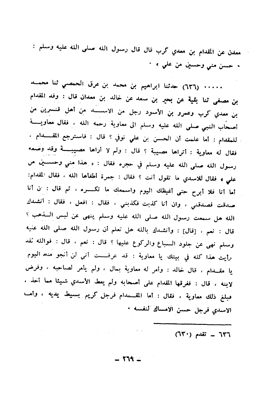636 - حَدَّثَنَا إِبْرَاهِيمُ بْنُ مُحَمَّدِ بْنِ عِرْقٍ الْحِمْصِيُّ، ثنا مُحَمَّدُ بْنُ مُصَفَّى، ثنا بَقِيَّةُ، عَنْ بَحِيرِ بْنِ سَعْدٍ، عَنْ خَالِدِ بْنِ مَعْدَانَ، قَالَ: وَفْدَ الْمِقْدَامُ بْنُ مَعْدِي كَرِبٍ، وَعَمْرُو بْنُ الْأَسْوَدِ - رَجُلٌ مِنَ الْأَسَدِ مِنْ أَهْلِ قِنَّسْرِينَ مِنْ أَصْحَابِ النَّبِيِّ صَلَّى اللهُ عَلَيْهِ وَسَلَّمَ - إِلَى مُعَاوِيَةَ رَحِمَهُ اللهُ، فَقَالَ مُعَاوِيَةُ لِلْمِقْدَامِ: أَمَا عَلِمْتَ أَنَّ الْحَسَنَ بْنَ عَلِيٍّ تُوُفِّيَ؟ قَالَ: فَاسْتَرْجَعَ الْمِقْدَامُ، فَقَالَ لَهُ مُعَاوِيَةُ: أَتَرَاهَا مُصِيبَةً؟ قَالَ: وَلِمَ لَا أَرَاهَا مُصِيبَةً؟ وَقَدْ وَضَعَهُ رَسُولُ اللهِ صَلَّى اللهُ عَلَيْهِ وَسَلَّمَ فِي حِجْرِهِ فَقَالَ: «§هَذَا مِنِّي، وَحُسَيْنٌ مِنْ عَلِيٍّ» ، فَقَالَ لِلْأَسَدِيِّ: مَا تَقُولُ أَنْتَ؟ فَقَالَ: جَمْرَةٌ أَطْفَأَهَا اللهُ، فَقَالَ الْمِقْدَامُ: أَمَّا أَنَا فَلَا أَبْرَحُ الْيَوْمَ حَتَّى أَغَيِظَكَ الْيَوْمَ وَأُسْمِعَكَ مَا تَكْرَهُ