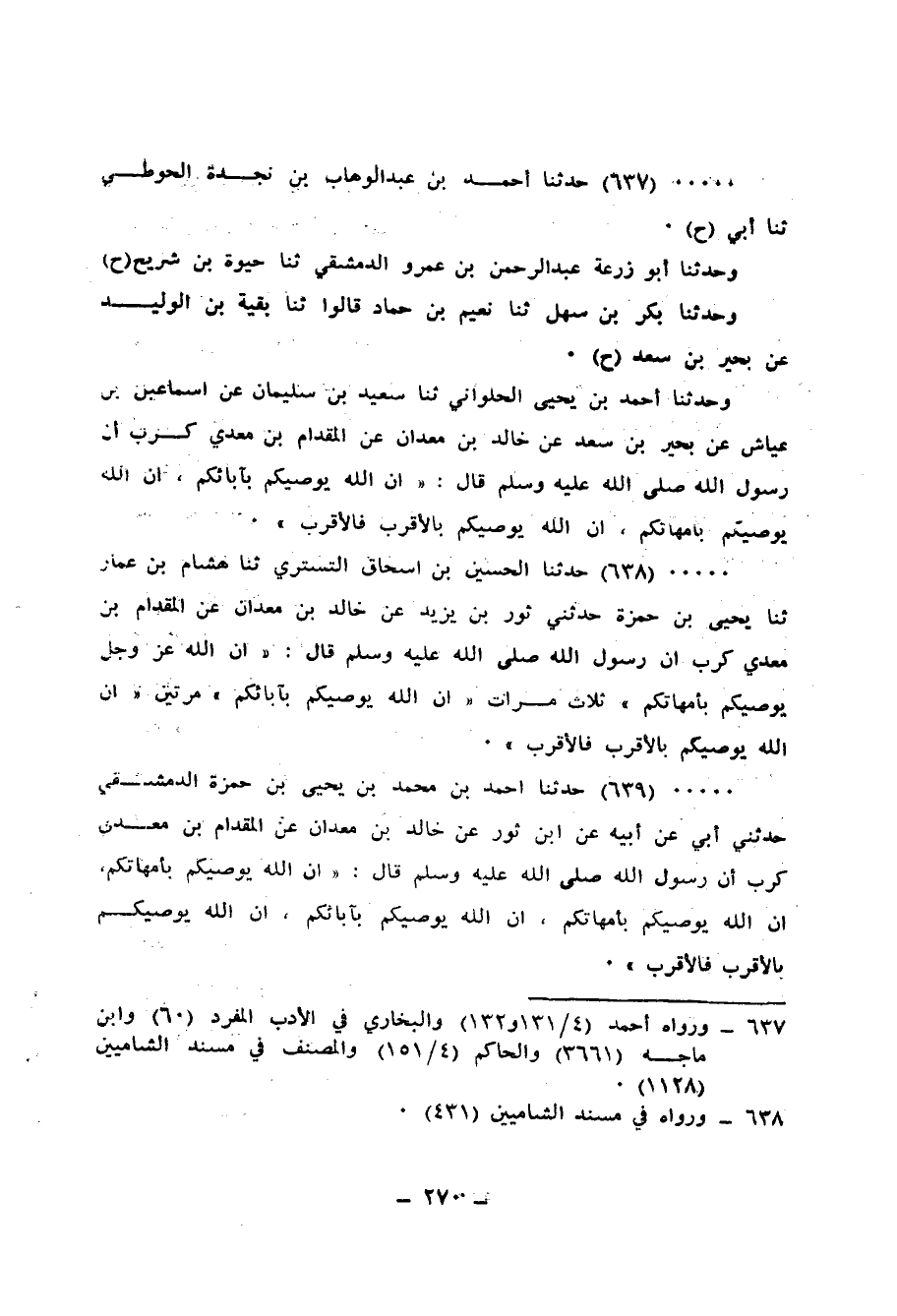 638 - حَدَّثَنَا الْحُسَيْنُ بْنُ إِسْحَاقَ التُّسْتَرِيُّ، ثنا هِشَامُ بْنُ عَمَّارٍ، ثنا يَحْيَى بْنُ حَمْزَةَ، حَدَّثَنِي ثَوْرُ بْنُ يَزِيدَ، عَنْ خَالِدِ بْنِ مَعْدَانَ، عَنِ الْمِقْدَامِ بْنِ مَعْدِي كَرِبٍ، أَنَّ رَسُولَ اللهِ صَلَّى اللهُ عَلَيْهِ وَسَلَّمَ قَالَ: «إِنَّ» §اللهَ عَزَّ وَجَلَّ يُوصِيكُمْ بِأُمَّهَاتِكُمْ - ثَلَاثَ مَرَّاتٍ -، إِنَّ اللهَ يُوصِيكُمْ بِآبَائِكُمْ - مَرَّتَيْنِ - إِنَّ اللهَ يُوصِيكُمْ بِالْأَقْرَبِ فَالْأَقْرَبِ "