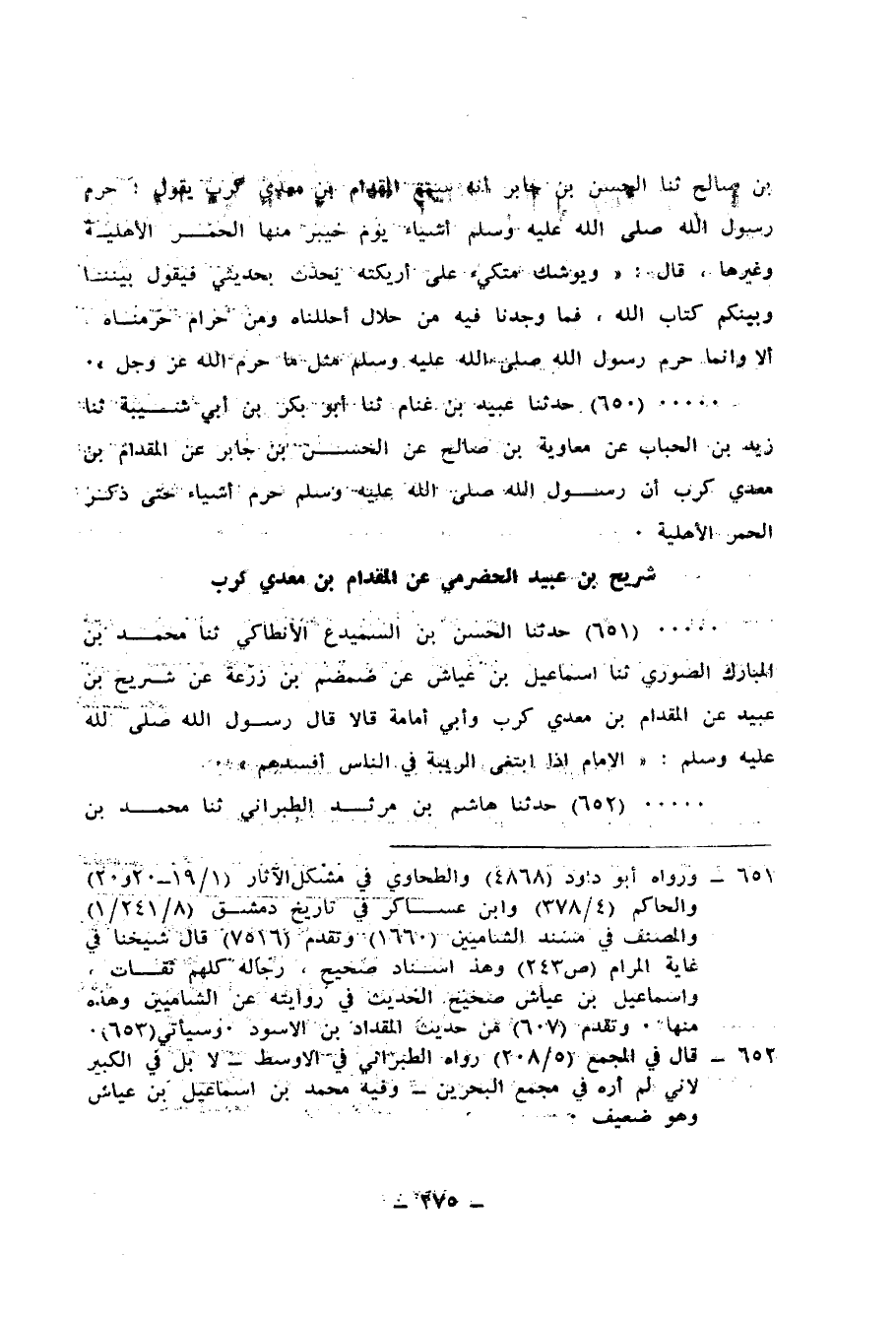 650 - حَدَّثَنَا عُبَيْدُ بْنُ غَنَّامٍ، ثنا أَبُو بَكْرِ بْنُ أَبِي شَيْبَةَ، ثنا زَيْدُ بْنُ الْحُبَابِ، عَنْ مُعَاوِيَةَ بْنِ صَالِحٍ، عَنِ الْحَسَنِ بْنِ جَابِرٍ، عَنِ الْمِقْدَامِ بْنِ مَعْدِي كَرِبٍ، «أَنَّ رَسُولَ اللهِ صَلَّى اللهُ عَلَيْهِ وَسَلَّمَ §حَرَّمَ أَشْيَاءَ حَتَّى ذَكَرَ الْحُمُرَ الْأَهْلِيَّةَ»