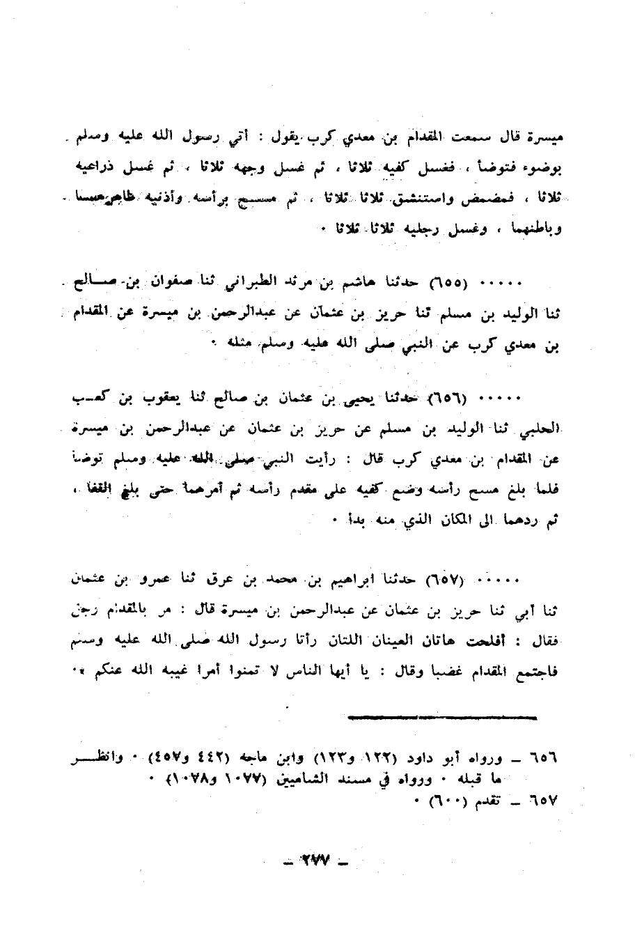 656 - حَدَّثَنَا يَحْيَى بْنُ عُثْمَانَ بْنِ صَالِحٍ، ثنا يَعْقُوبُ بْنُ كَعْبٍ الْحَلَبِيُّ، ثنا الْوَلِيدُ بْنُ مُسْلِمٍ، عَنْ حَرِيزِ بْنِ عُثْمَانَ، عَنْ عَبْدِ الرَّحْمَنِ بْنِ مَيْسَرَةَ، عَنِ الْمِقْدَامِ بْنِ مَعْدِي كَرِبٍ، قَالَ: «رَأَيْتُ النَّبِيَّ صَلَّى اللهُ عَلَيْهِ وَسَلَّمَ» §تَوَضَّأَ، فَلَمَّا بَلَغَ مَسْحَ رَأْسِهِ وَضَعَ كَفَّيْهِ عَلَى مُقَدَّمِ رَأْسِهِ، ثُمَّ أَمَرَّهُمَا حَتَّى بَلَغَ الْقَفَا، ثُمَّ رَدَّهُمَا إِلَى الْمَكَانِ الَّذِي مِنْهُ بَدَأَ "