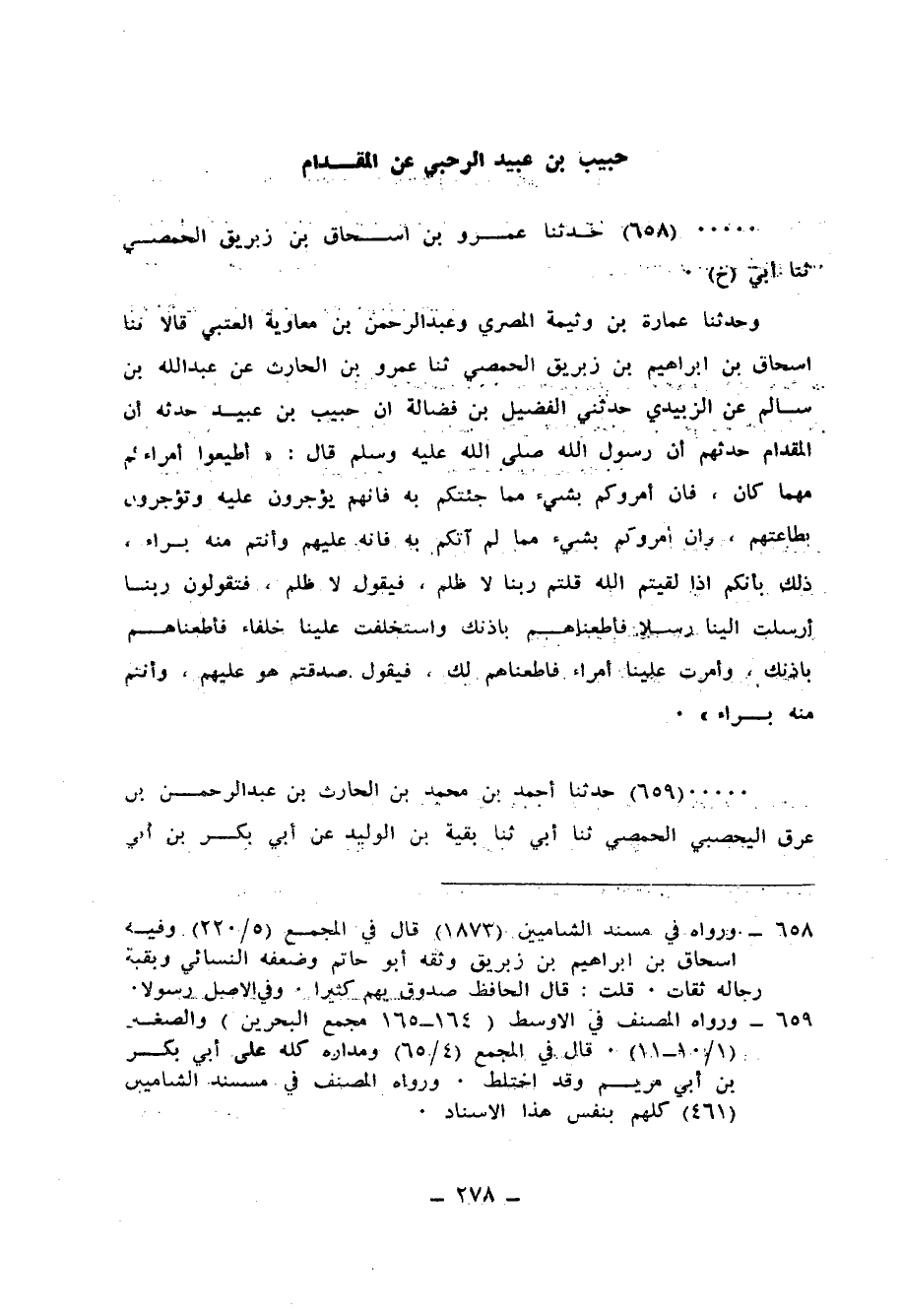 658 - حَدَّثَنَا عَمْرُو بْنُ إِسْحَاقَ بْنِ زِبْرِيقٍ الْحِمْصِيُّ، ثنا أَبِي، ح وَحَدَّثَنَا عُمَارَةُ بْنُ وَثِيمَةَ الْمِصْرِيُّ، وَعَبْدُ الرَّحْمَنِ بْنُ مُعَاوِيَةَ الْعُتْبِيُّ، قَالَا: ثنا إِسْحَاقُ بْنُ إِبْرَاهِيمَ بْنِ زِبْرِيقٍ الْحِمْصِيُّ، ثنا عَمْرُو بْنُ الْحَارِثِ، عَنْ عَبْدِ اللهِ بْنِ سَالِمٍ، عَنِ الزُّبَيْدِيِّ، حَدَّثَنِي الْفُضَيْلُ بْنُ فَضَالَةَ، أَنَّ حَبِيبَ بْنَ عُبَيْدٍ حَدَّثَهُ، أَنَّ الْمِقْدَامَ حَدَّثَهُمْ، أَنَّ رَسُولَ اللهِ صَلَّى اللهُ عَلَيْهِ وَسَلَّمَ قَالَ: " §أَطِيعُوا أُمَرَاءَكُمْ مَهْمَا كَانَ، فَإِنْ أَمَرُوكُمْ بِشَيْءٍ مِمَّا جِئْتُكُمْ بِهِ فَإِنَّهُمْ يُؤْجَرُونَ عَلَيْهِ وَتُؤْجَرُونَ بِطَاعَتِهِمْ، وَإِنْ أَمَرُوكُمْ بِشَيْءٍ مِمَّا لَمْ آتِكُمْ بِهِ فَإِنَّهُ عَلَيْهِمْ وَأَنْتُمْ مِنْهُ بَرَاءٌ، ذَلِكَ بِأَنَّكُمْ إِذَا لَقِيتُمُ اللهَ قُلْتُمْ: رَبَّنَا، لَا ظُلْمَ، فَيَقُولُ: لَا ظُلْمَ، فَتَقُولُونَ: رَبَّنَا، أَرْسَلْتَ إِلَيْنَا رُسُلًا فَأَطَعْنَاهُمْ بِإِذْنِكَ وَاسْتَخْلَفْتَ عَلَيْنَا خُلَفَاءَ فَأَطَعْنَاهُمْ بِإِذْنِكَ، وَأَمَّرْتَ عَلَيْنَا أُمَرَاءَ فَأَطَعْنَاهُمْ لَكَ، فَيَقُولُ: صَدَقْتُمْ، هُوَ عَلَيْهِمْ وَأَنْتُمْ مِنْهُ بَرَاءٌ "