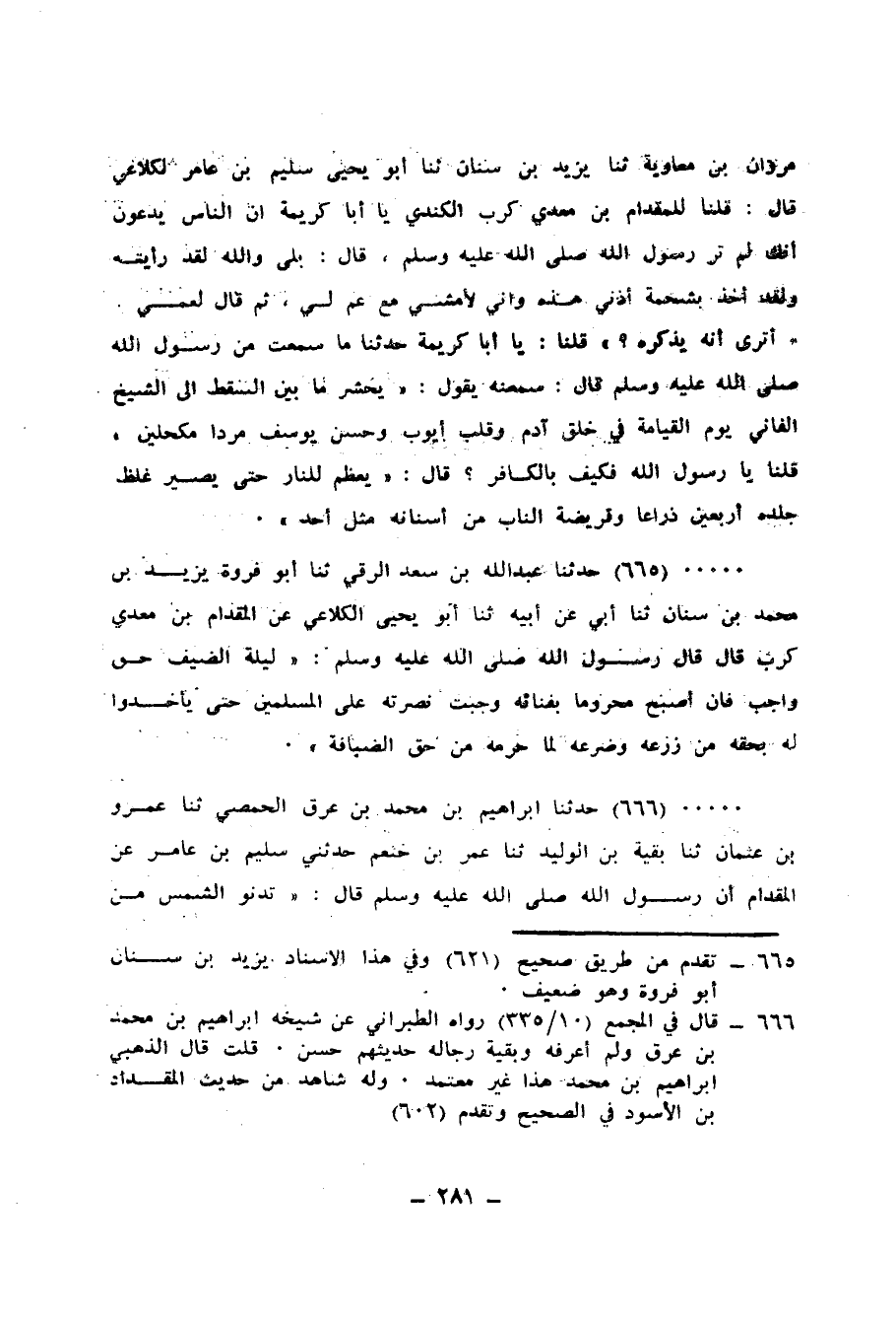 666 - حَدَّثَنَا إِبْرَاهِيمُ بْنُ مُحَمَّدِ بْنِ عِرْقٍ الْحِمْصِيُّ، ثنا عَمْرُو بْنُ عُثْمَانَ، ثنا بَقِيَّةُ بْنُ الْوَلِيدِ، ثنا عُمَرُ بْنُ جُعْثُمٍ، حَدَّثَنِي سُلَيْمُ بْنُ عَامِرٍ، عَنِ الْمِقْدَامِ، أَنَّ رَسُولَ اللهِ صَلَّى اللهُ عَلَيْهِ وَسَلَّمَ قَالَ: «§تَدْنُو الشَّمْسُ مِنَ النَّاسِ يَوْمَ الْقِيَامَةِ حَتَّى تَكُونَ مِنَ النَّاسِ عَلَى قَدْرِ مِيلَيْنِ، وَيَزْدَادَ فِي حَرِّهَا فَتَصْحَرَهُمْ فَيَكُونُوا فِي الْعَرَقِ بِقَدْرِ أَعْمَالِهِمْ، فَمِنْهُمْ مَنْ يَأْخُذُهُ الْعَرَقُ إِلَى كَعْبَيْهِ، وَمِنْهُمْ مَنْ يَأْخُذُهُ إِلَى رُكْبَتَيْهِ، وَمِنْهُمْ مَنْ يَأْخُذُهُ إِلَى حِقْوَيْهِ، وَمِنْهُمْ مَنْ يُلْجِمُهُ الْعَرَقُ إِلْجَامًا» قَالَ: وَرَأَيْتُ رَسُولَ اللهِ صَلَّى اللهُ عَلَيْهِ وَسَلَّمَ يُشِيرُ بِيَدَيْهِ إِلَى فِيهِ قَالَ إِبْرَاهِيمُ بْنُ عِرْقٍ: هَكَذَا رَوَاهُ عُمَرُ بْنُ خَثْعَمٍ، عَنْ سُلَيْمٍ، عَنِ الْمِقْدَامِ