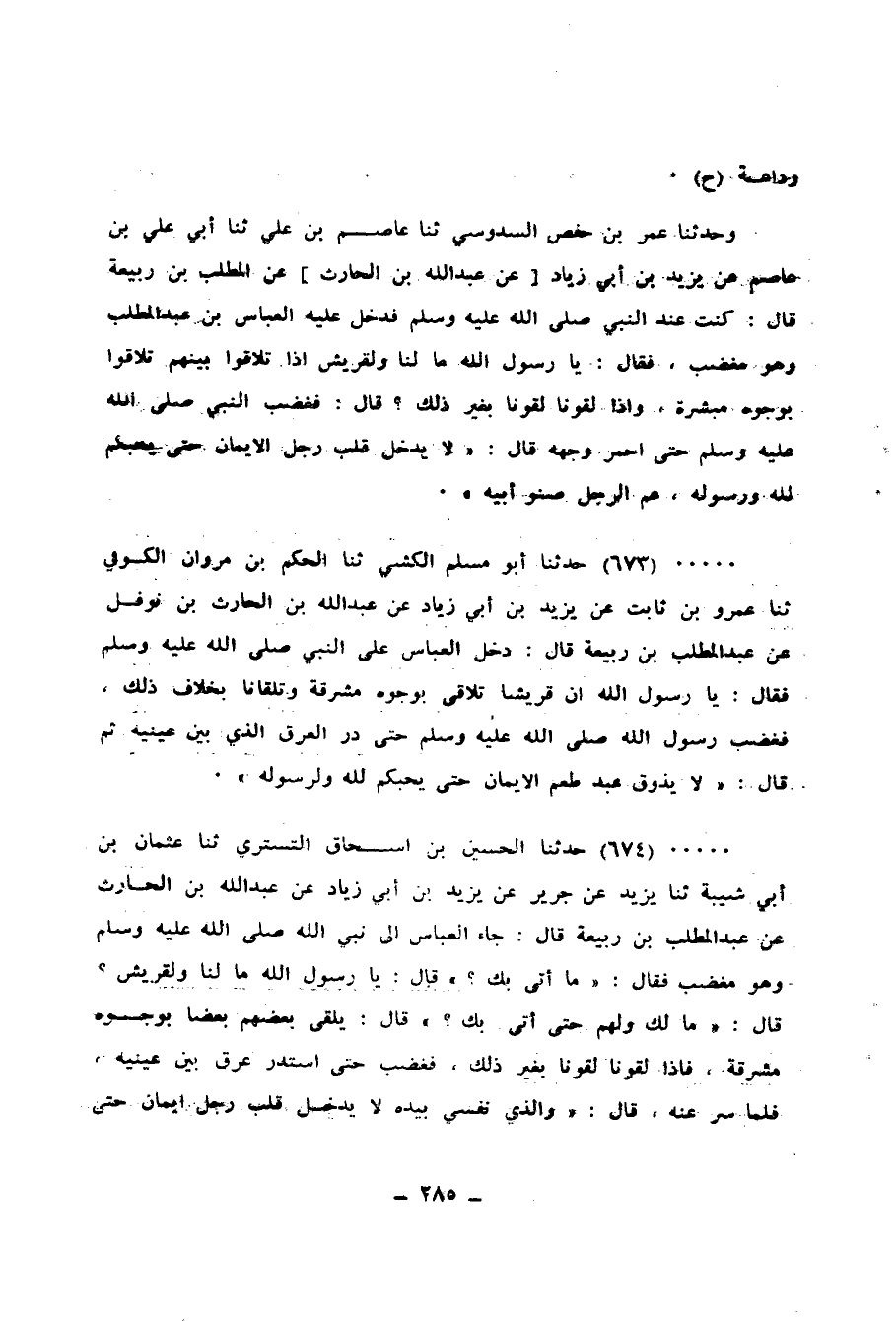673 - حَدَّثَنَا أَبُو مُسْلِمٍ الْكَشِّيُّ، ثنا الْحَكَمُ بْنُ مَرْوَانَ الْكُوفِيُّ، ثنا عَمْرُو بْنُ ثَابِتٍ، عَنْ يَزِيدَ بْنِ أَبِي زِيَادٍ، عَنْ عَبْدِ اللهِ بْنِ الْحَارِثِ بْنِ نَوْفَلٍ، عَنْ عَبْدِ الْمُطَّلِبِ بْنِ رَبِيعَةَ، قَالَ: دَخَلَ الْعَبَّاسُ عَلَى النَّبِيِّ صَلَّى اللهُ عَلَيْهِ وَسَلَّمَ فَقَالَ: يَا رَسُولَ اللهِ، إِنَّ قُرَيْشًا تَلَاقَى بِوُجُوهٍ مُشْرِقَةٍ، وَتَلْقَانَا بِخِلَافِ ذَلِكَ، فَغَضِبَ رَسُولُ اللهِ صَلَّى اللهُ عَلَيْهِ وَسَلَّمَ حَتَّى دَرَّ الْعَرَقُ الَّذِي بَيْنَ عَيْنَيْهِ ثُمَّ قَالَ: «§لَا يَذُوقُ عَبْدٌ طَعْمَ الْإِيمَانِ حَتَّى يُحِبَّكُمْ لِلَّهِ وَلِرَسُولِهِ»