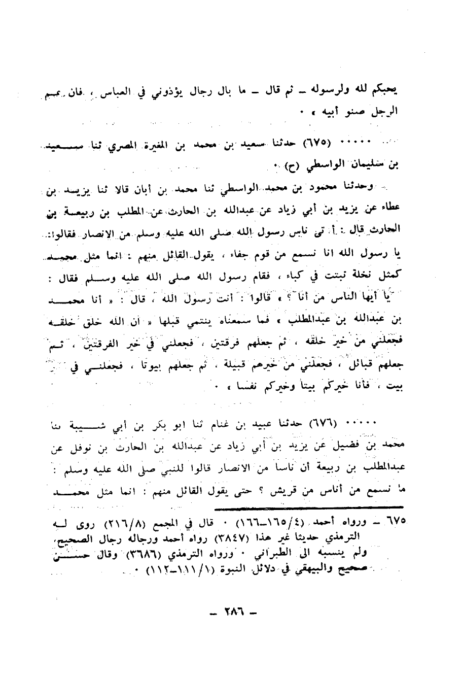 675 - حَدَّثَنَا سَعِيدُ بْنُ مُحَمَّدِ بْنِ الْمُغِيرَةِ الْمِصْرِيُّ، ثنا سَعِيدُ بْنُ سُلَيْمَانَ الْوَاسِطِيُّ، ح وَحَدَّثَنَا مَحْمُودُ بْنُ مُحَمَّدٍ الْوَاسِطِيُّ، ثنا مُحَمَّدُ بْنُ أَبَانَ، قَالَا: ثنا يَزِيدُ بْنُ عَطَاءٍ، عَنْ يَزِيدَ بْنِ أَبِي زِيَادٍ، عَنْ عَبْدِ اللهِ بْنِ الْحَارِثِ، عَنِ الْمُطَّلِبِ بْنِ رَبِيعَةَ بْنِ الْحَارِثِ، قَالَ: أَتَى نَاسٌ رَسُولَ اللهِ صَلَّى اللهُ عَلَيْهِ وَسَلَّمَ مِنَ الْأَنْصَارِ فَقَالُوا: يَا رَسُولَ اللهِ، إِنَّا نَسْمَعُ مِنْ قَوْمٍ جَفَاءً، يَقُولُ الْقَائِلُ مِنْهُمْ: إِنَّمَا مِثْلُ مُحَمَّدٍ كَمِثْلِ نَخْلَةٍ نَبَتَتْ فِي كِبَاءٍ، فَقَامَ رَسُولُ اللهِ صَلَّى اللهُ عَلَيْهِ وَسَلَّمَ فَقَالَ: «يَا أَيُّهَا النَّاسُ، مَنْ أَنَا؟» قَالُوا: أَنْتَ رَسُولُ اللهِ، قَالَ: «§أَنَا مُحَمَّدُ بْنُ عَبْدِ اللهِ بْنِ عَبْدِ الْمُطَّلِبِ - فَمَا سَمِعْنَاهُ يَنْتَمِي قَبْلَهَا - إِنَّ اللهَ خَلَقَ خَلْقَهُ فَجَعَلَنِي مِنْ خَيْرِ خَلْقِهِ، ثُمَّ جَعَلَهُمْ فِرْقَتَيْنِ، فَجَعَلَنِي فِي خَيْرِ الْفِرْقَتَيْنِ، ثُمَّ جَعَلَهُمْ قَبَائِلَ، فَجَعَلَنِي مِنْ خَيْرِهِمْ قَبِيلَةً، ثُمَّ جَعَلَهُمْ بُيُوتًا فَجَعَلَنِي فِي خَيْرِ بَيْتٍ، فَأَنَا خَيْرُكُمْ بَيْتًا، وَخَيْرُكُمْ نَفْسًا»