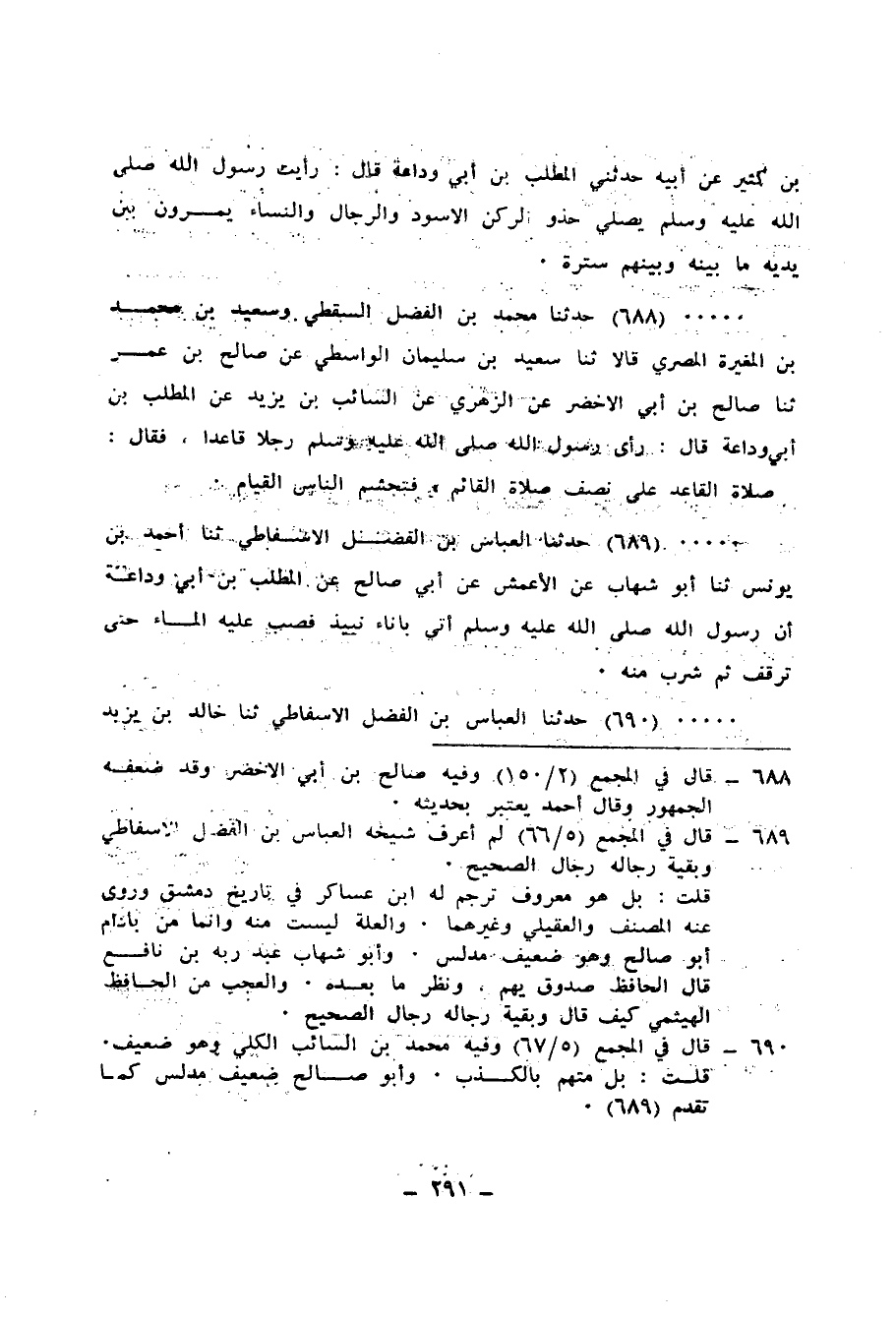 688 - حَدَّثَنَا مُحَمَّدُ بْنُ الْفَضْلِ السَّقَطِيُّ، وَسَعِيدُ بْنُ مُحَمَّدِ بْنِ الْمُغِيرَةِ الْمِصْرِيُّ، قَالَا: ثنا سَعِيدُ بْنُ سُلَيْمَانَ الْوَاسِطِيُّ، عَنْ صَالِحِ بْنِ عُمَرَ، ثنا صَالِحُ بْنُ أَبِي الْأَخْضَرِ، عَنِ الزُّهْرِيِّ، عَنِ السَّائِبِ بْنِ يَزِيدَ، عَنِ الْمُطَّلِبِ بْنِ أَبِي وَدَاعَةَ، قَالَ: رَأَى رَسُولُ اللهِ صَلَّى اللهُ عَلَيْهِ وَسَلَّمَ رَجُلًا يُصَلِّي قَاعِدًا فَقَالَ: «§صَلَاةُ الْقَاعِدِ عَلَى نِصْفِ صَلَاةِ الْقَائِمِ» فَتَجَشَّمَ النَّاسُ الْقِيَامَ