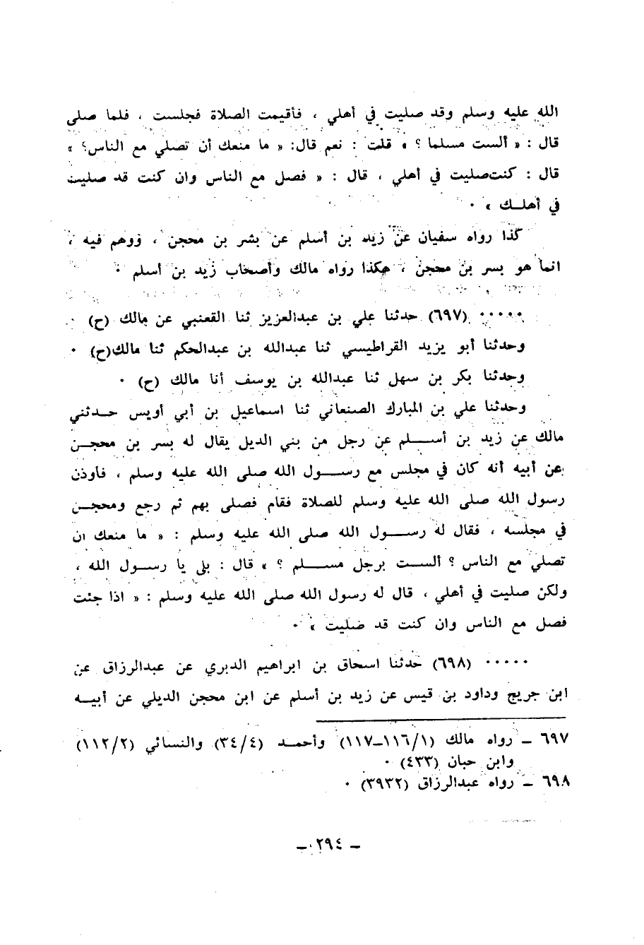 697 - حَدَّثَنَا عَلِيُّ بْنُ عَبْدِ الْعَزِيزِ، ثنا الْقَعْنَبِيُّ، عَنْ مَالِكٍ، ح وَحَدَّثَنَا أَبُو يَزِيدَ الْقَرَاطِيِسِيُّ، ثنا عَبْدُ اللهِ بْنُ عَبْدِ الْحَكَمِ، ثنا مَالِكٌ، ح وَحَدَّثَنَا بَكْرُ بْنُ سَهْلٍ، ثنا عَبْدُ اللهِ بْنُ يُوسُفَ، أَنَا مَالِكٌ، ح وَحَدَّثَنَا عَلِيُّ بْنُ الْمُبَارَكِ الصَّنْعَانِيُّ، ثنا إِسْمَاعِيلُ بْنُ أَبِي أُوَيْسٍ، حَدَّثَنِي مَالِكٌ، عَنْ زَيْدِ بْنِ أَسْلَمَ، عَنْ رَجُلٍ مِنْ بَنِي الدِّيلِ يُقَالُ لَهُ: بُسْرُ بْنُ مِحْجَنٍ، عَنْ أَبِيهِ، أَنَّهُ كَانَ فِي مَجْلِسٍ مَعَ رَسُولِ اللهِ صَلَّى اللهُ عَلَيْهِ وَسَلَّمَ، فَأُوذِنَ رَسُولُ اللهِ صَلَّى اللهُ عَلَيْهِ وَسَلَّمَ لِلصَّلَاةِ، فَقَامَ فَصَلَّى بِهِمْ، ثُمَّ رَجَعَ وَمِحْجَنٌ فِي مَجْلِسِهِ، فَقَالَ لَهُ رَسُولُ اللهِ صَلَّى اللهُ عَلَيْهِ وَسَلَّمَ: «مَا مَنَعَكَ أَنْ تُصَلِّيَ مَعَ النَّاسِ؟ أَلَسْتَ بِرَجُلٍ مُسْلِمٍ؟» قَالَ: بَلَى يَا رَسُولَ اللهِ، وَلَكِنْ صَلَّيْتُ فِي أَهْلِي، قَالَ لَهُ رَسُولُ اللهِ صَلَّى اللهُ عَلَيْهِ وَسَلَّمَ: «§إِذَا جِئْتَ فَصَلِّ مَعَ النَّاسِ وَإِنْ كُنْتَ قَدْ صَلَّيْتَ»
