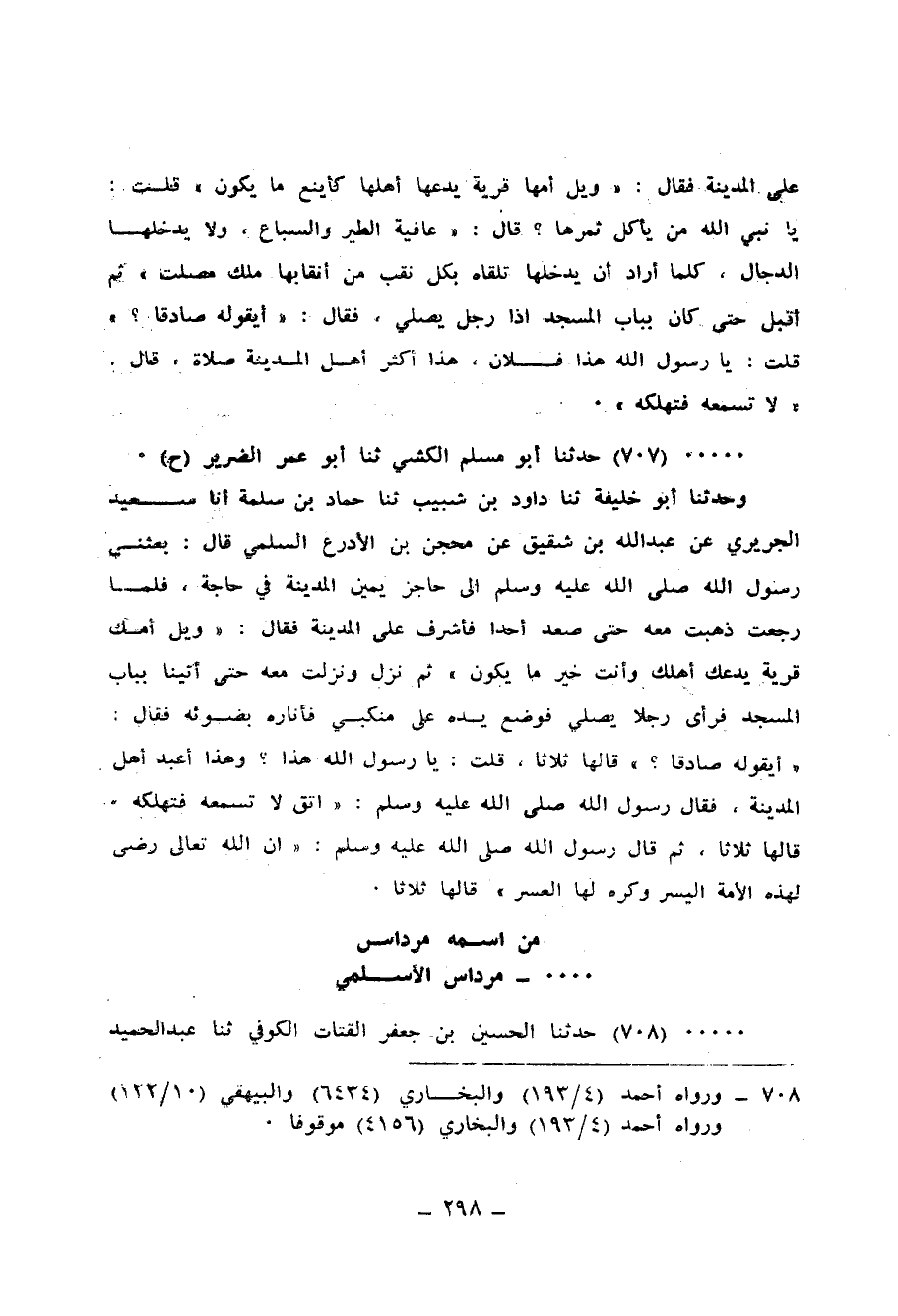 707 - حَدَّثَنَا أَبُو مُسْلِمٍ الْكَشِّيُّ، ثنا أَبُو عُمَرَ الضَّرِيرُ، ح وَحَدَّثَنَا أَبُو خَلِيفَةَ، ثنا دَاوُدُ بْنُ شَبِيبٍ، ثنا حَمَّادُ بْنُ سَلَمَةَ، أَنَا سَعِيدٌ الْجُرَيْرِيُّ، عَنْ عَبْدِ اللهِ بْنِ شَقِيقٍ، عَنْ مِحْجَنِ بْنِ الْأَدْرَعِ السُّلَمِيِّ قَالَ: بَعَثَنِي رَسُولُ اللهِ صَلَّى اللهُ عَلَيْهِ وَسَلَّمَ إِلَى حَاجِزٍ يَمِينَ الْمَدِينَةِ فِي حَاجَةٍ، فَلَمَّا رَجَعْتُ ذَهَبْتُ مَعَهُ حَتَّى صَعِدَ أُحُدًا فَأَشْرَفَ عَلَى الْمَدِينَةِ فَقَالَ: «§وَيْلٌ أُمِّكَ قَرْيَةً، يَدَعُكِ أَهْلُكِ وَأَنْتِ خَيْرُ مَا يَكُونُ» ، ثُمَّ نَزَلَ وَنَزَلْتُ مَعَهُ حَتَّى أَتَيْنَا بِبَابِ الْمَسْجِدِ، فَرَأَى رَجُلًا يُصَلِّي فَوَضَعَ يَدَهُ عَلَى مَنْكِبِي فَأَنَارَهُ بِضَوْئِهِ فَقَالَ: «أَيَقُولُهُ صَادِقًا؟» قَالَهَا ثَلَاثًا، قُلْتُ: يَا رَسُولَ اللهِ، هَذَا وَهَذَا أَعْبُدُ أَهْلِ الْمَدِينَةِ، فَقَالَ رَسُولُ اللهِ صَلَّى اللهُ عَلَيْهِ وَسَلَّمَ: «اتَّقِ، لَا تُسْمِعْهُ فَتُهْلِكَهُ» قَالَهَا ثَلَاثًا