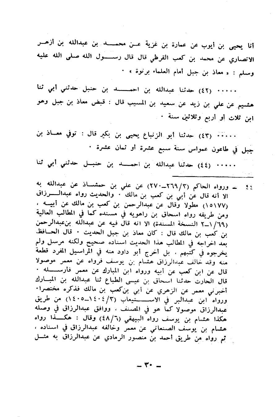 42 - حَدَّثَنَا عَبْدُ اللهِ بْنُ أَحْمَدَ بْنِ حَنْبَلٍ، حَدَّثَنِي أَبِي، ثنا هُشَيْمُ، عَنْ عَلِيِّ بْنِ زَيْدٍ، عَنْ سَعِيدِ بْنِ الْمُسَيِّبِ قَالَ: «§قُبِضَ مُعَاذُ بْنُ جَبَلٍ وَهُوَ ابْنُ ثَلَاثٍ أَوْ أَرْبَعٍ وَثَلَاثِينَ سَنَةً»