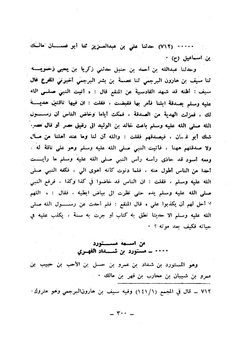 712 - حَدَّثَنَا عَلِيُّ بْنُ عَبْدِ الْعَزِيزِ، ثنا أَبُو غَسَّانَ مَالِكُ بْنُ إِسْمَاعِيلَ، ح وَحَدَّثَنَا عَبْدُ اللهِ بْنُ أَحْمَدَ بْنِ حَنْبَلٍ، حَدَّثَنِي زَكَرِيَّا بْنُ يَحْيَى زَحْمَوَيْهِ، ثنا سَيْفُ بْنُ هَارُونَ الْبُرْجُمِيُّ، ثنا عِصْمَةُ بْنُ بِشْرٍ الْبُرْجُمِيُّ، أَخْبَرَنِي الْمُفْرَعُ، - قَالَ سَيْفٌ: أَظُنُّهُ قَدْ شَهِدَ الْقَادِسِيَّةَ - عَنِ الْمُنْقَعِ قَالَ: أَتَيْتُ النَّبِيَّ صَلَّى اللهُ عَلَيْهِ وَسَلَّمَ بِصَدَقَةِ إِبِلِنَا، فَأَمَرَ بِهَا فَقُبِضَتْ فَقُلْتُ: إِنَّ فِيهَا نَاقَتَيْنِ هَدِيَّةً لَكَ، فَعُزِلَتِ الْهَدِيَّةُ مِنَ الصَّدَقَةِ، فَمَكَثَ أَيَّامًا وَخَاضَ النَّاسُ أَنَّ رَسُولَ اللهِ صَلَّى اللهُ عَلَيْهِ وَسَلَّمَ بَاعِثٌ خَالِدَ بْنَ الْوَلِيدِ إِلَى رَقِيقِ مِصْرَ - أَوْ قَالَ: مِصْرَ، شَكَّ أَبُو غَسَّانَ - فَيُصْدِقُهُمْ فَقُلْتُ: وَاللهِ إِنَّ لَنَا وَمَا عِنْدَ أَهْلِنَا مِنْ مَالٍ وَلَا صَدَقَتَهُمْ هَهُنَا، فَأَتَيْتُ النَّبِيَّ صَلَّى اللهُ عَلَيْهِ وَسَلَّمَ وَهُوَ عَلَى نَاقَةٍ لَهُ وَمَعَهُ أَسْوَدٌ قَدْ حَاذَى رَأْسُهُ رَأْسَ النَّبِيِّ صَلَّى اللهُ عَلَيْهِ وَسَلَّمَ، مَا رَأَيْتُ أَحَدًا مِنَ النَّاسِ أَطْوَلَ مِنْهُ، فَلَمَّا دَنَوْتُ كَأَنَّهُ أَهْوَى إِلَيَّ، فَكَفَّهُ النَّبِيُّ صَلَّى اللهُ عَلَيْهِ وَسَلَّمَ، فَقُلْتُ: إِنَّ النَّاسَ قَدْ خَاضُوا فِي كَذَا وَكَذَا، فَرَفَعَ النَّبِيُّ صَلَّى اللهُ عَلَيْهِ وَسَلَّمَ يَدَهُ حَتَّى نَظَرْتُ إِلَى بَيَاضِ إِبْطَيْهِ، فَقَالَ: «§اللهُمَّ لَا أُحِلُّ لَهُمْ أَنْ يَكْذِبُوا عَلَيَّ» قَالَ الْمُنْقَعُ: «فَلَمْ أُحَدِّثْ عَنْ رَسُولِ اللهِ صَلَّى اللهُ عَلَيْهِ وَسَلَّمَ إِلَّا حَدِيثًا نَطَقَ بِهِ كِتَابٌ، أَوْ جَرَتْ بِهِ سُنَّةٌ، يُكْذَبُ عَلَيْهِ فِي حَيَاتِهِ، فَكَيْفَ بَعْدَ مَوْتِهِ؟»
