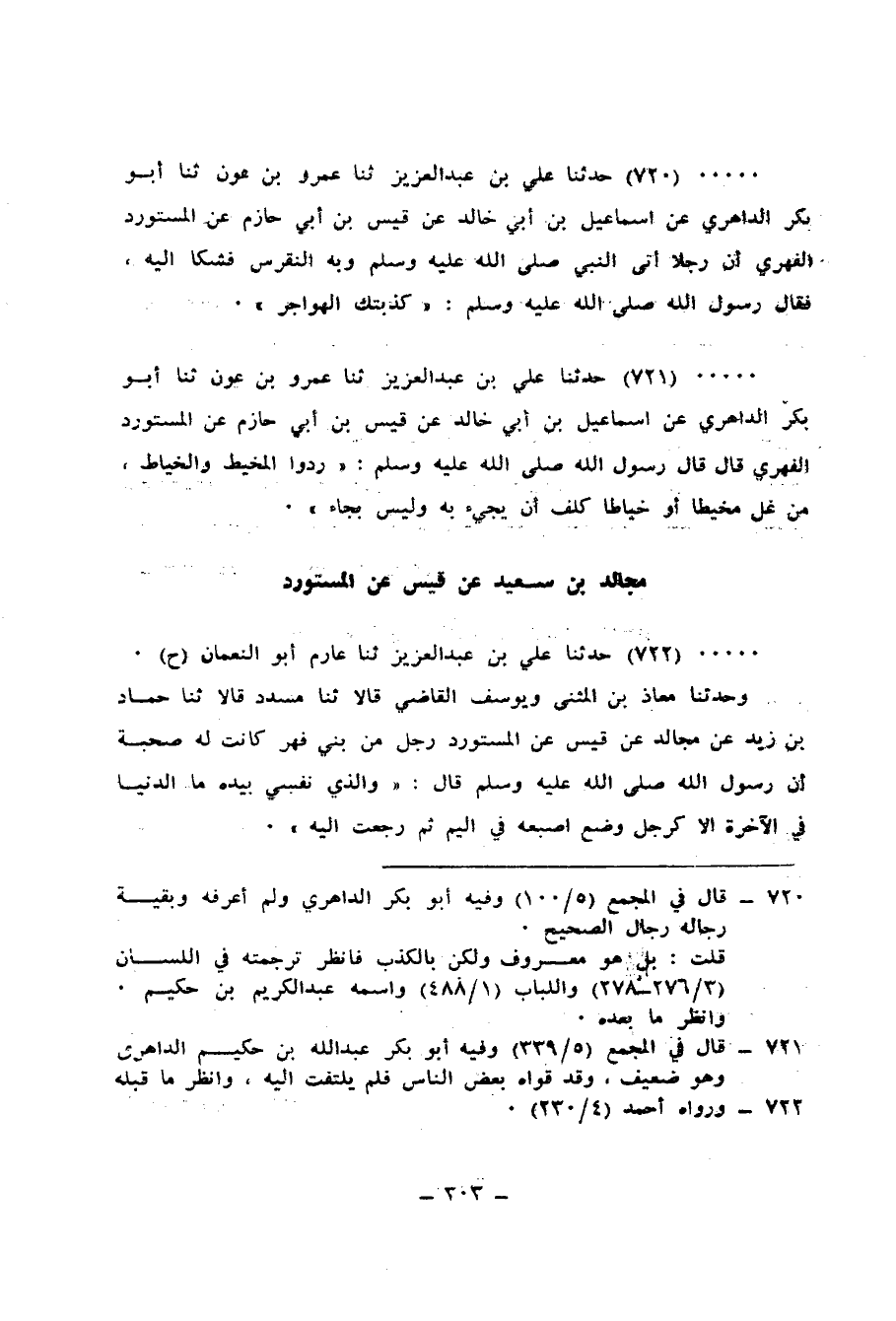 721 - حَدَّثَنَا عَلِيُّ بْنُ عَبْدِ الْعَزِيزِ، ثنا عَمْرُو بْنُ عَوْنٍ، ثنا أَبُو بَكْرٍ الدَّاهِرِيُّ، عَنْ إِسْمَاعِيلَ بْنِ أَبِي خَالِدٍ، عَنْ قَيْسِ بْنِ أَبِي حَازِمٍ، عَنِ الْمُسْتَوْرِدِ الْفِهْرِيِّ قَالَ: قَالَ رَسُولُ اللهِ صَلَّى اللهُ عَلَيْهِ وَسَلَّمَ: «§رُدُّوا الْمِخْيَطَ وَالْخَيَّاطَ، مَنْ غَلَّ مِخْيَطًا أَوْ خَيَّاطًا كُلِّفَ أَنْ يَجِيءَ بِهِ وَلَيْسَ بِجَاءٍ»