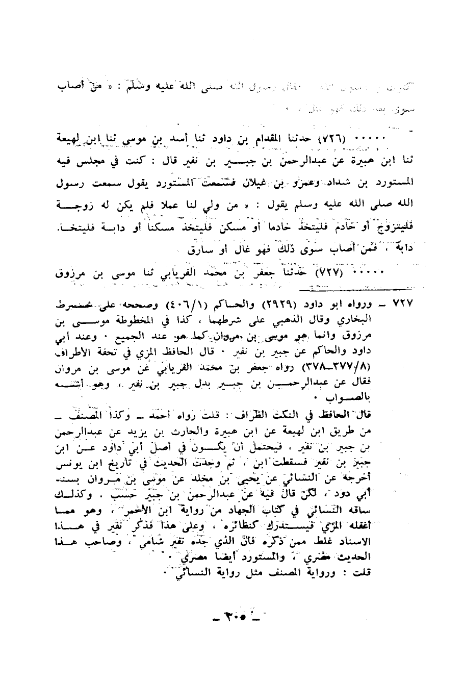 726 - حَدَّثَنَا الْمِقْدَامُ بْنُ دَاوُدَ، ثنا أَسَدُ بْنُ مُوسَى، ثنا ابْنُ لَهِيعَةَ، ثنا ابْنُ هُبَيْرَةَ، عَنْ عَبْدِ الرَّحْمَنِ بْنِ جُبَيْرِ بْنِ نُفَيْرٍ، قَالَ: كُنْتُ فِي مَجْلِسٍ فِيهِ الْمُسْتَوْرِدُ بْنُ شَدَّادٍ، وَعَمْرُو بْنُ غَيْلَانَ، فَسَمِعْتُ الْمُسْتَوْرِدَ يَقُولُ: سَمِعْتُ رَسُولَ اللهِ صَلَّى اللهُ عَلَيْهِ وَسَلَّمَ يَقُولُ: «§مَنْ وَلِيَ لَنَا عَمَلًا فَلَمْ يَكُنْ لَهُ زَوْجَةٌ فَلْيَتَزَوَّجْ، أَوْ خَادِمٌ فَلْيَتَّخِذْ خَادِمًا، أَوْ مَسْكَنٌ فَلْيَتَّخِذْ مَسْكَنًا، أَوْ دَابَّةٌ فَلْيَتَّخِذْ دَابَّةً، فَمَنْ أَصَابَ سِوَى ذَلِكَ فَهُوَ غَالٌّ أَوْ سَارِقٌ»