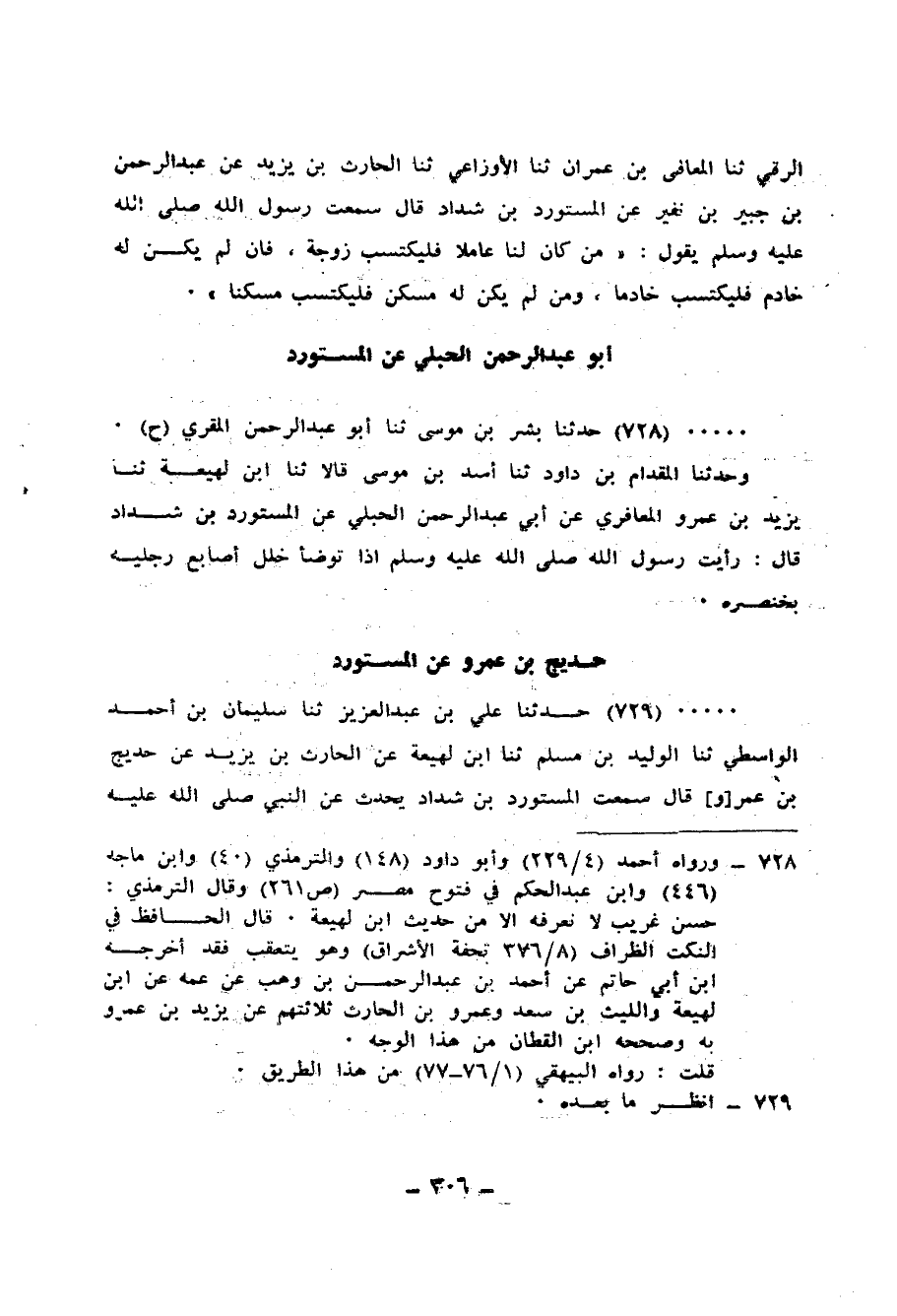 728 - حَدَّثَنَا بِشْرُ بْنُ مُوسَى، ثنا أَبُو عَبْدِ الرَّحْمَنِ الْمُقْرِي، ح وَحَدَّثَنَا الْمِقْدَامُ بْنُ دَاوُدَ، ثنا أَسَدُ بْنُ مُوسَى، قَالَا: ثنا ابْنُ لَهِيعَةَ، ثنا يَزِيدُ بْنُ عَمْرٍو الْمَعَافِرِيُّ، عَنْ أَبِي عَبْدِ الرَّحْمَنِ الْحُبُلِيِّ، عَنِ الْمُسْتَوْرِدِ بْنِ شَدَّادٍ، قَالَ: «رَأَيْتُ رَسُولَ اللهِ صَلَّى اللهُ عَلَيْهِ وَسَلَّمَ» §إِذَا تَوَضَّأَ خَلَّلَ أَصَابِعَ رِجْلَيْهِ بِخِنْصَرِهِ "