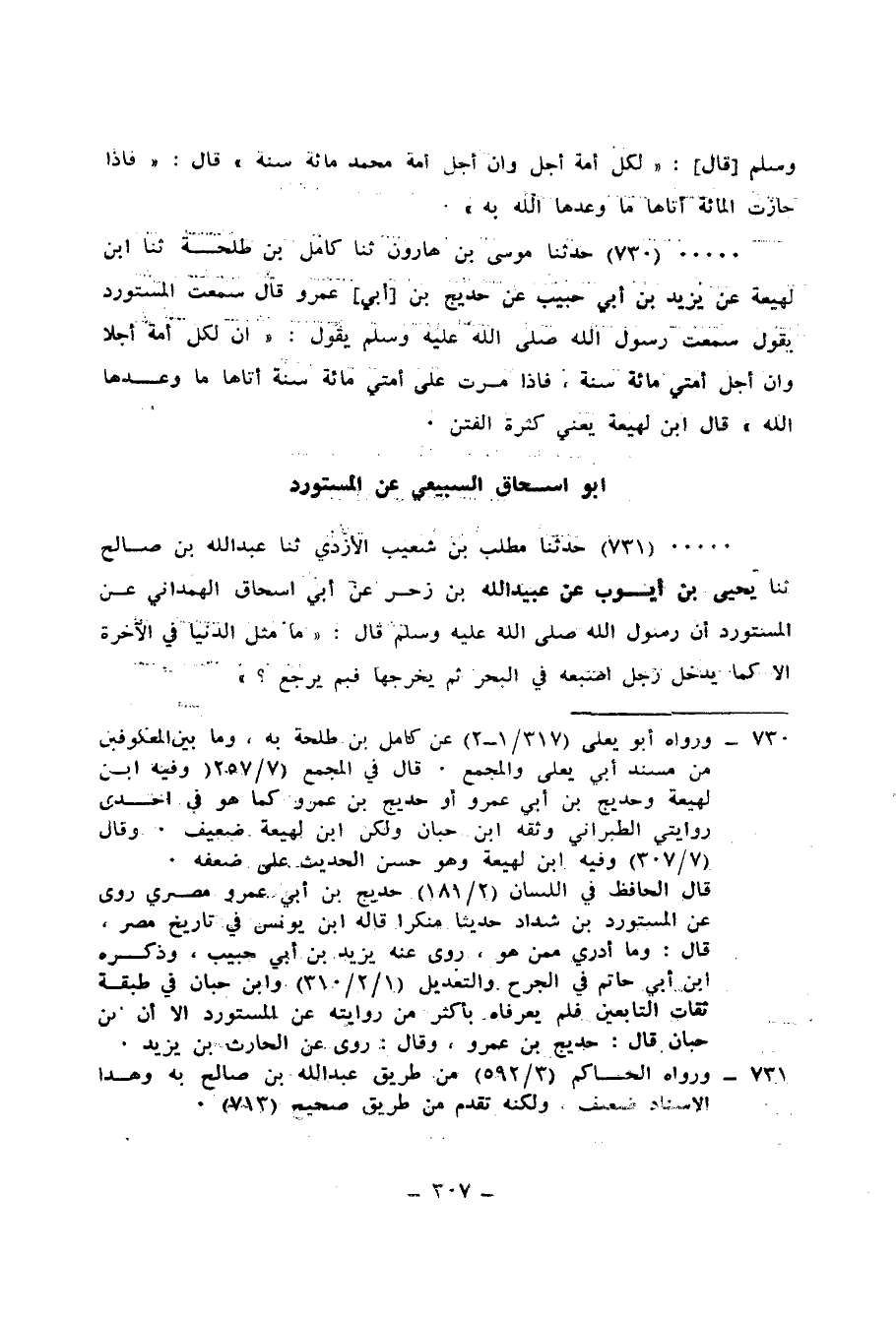 730 - حَدَّثَنَا مُوسَى بْنُ هَارُونَ، ثنا كَامِلُ بْنُ طَلْحَةَ، ثنا ابْنُ لَهِيعَةَ، عَنْ يَزِيدَ بْنِ أَبِي حَبِيبٍ، عَنْ حُدَيْجِ بْنِ أَبِي عَمْرٍو، قَالَ: سَمِعْتُ الْمُسْتَوْرِدَ يَقُولُ: سَمِعْتُ رَسُولَ اللهِ صَلَّى اللهُ عَلَيْهِ وَسَلَّمَ يَقُولُ: «إِنَّ §لِكُلِّ أُمَّةٍ أَجَلًا، وَإِنَّ أَجَلَ أُمَّتِي مِائَةُ سَنَةٍ، فَإِذَا مَرَّتْ عَلَى أُمَّتِي مِائَةُ سَنَةٍ أَتَاهَا مَا وَعَدَهَا اللهُ» قَالَ ابْنُ لَهِيعَةَ: «يَعْنِي كَثْرَةَ الْفِتَنِ»