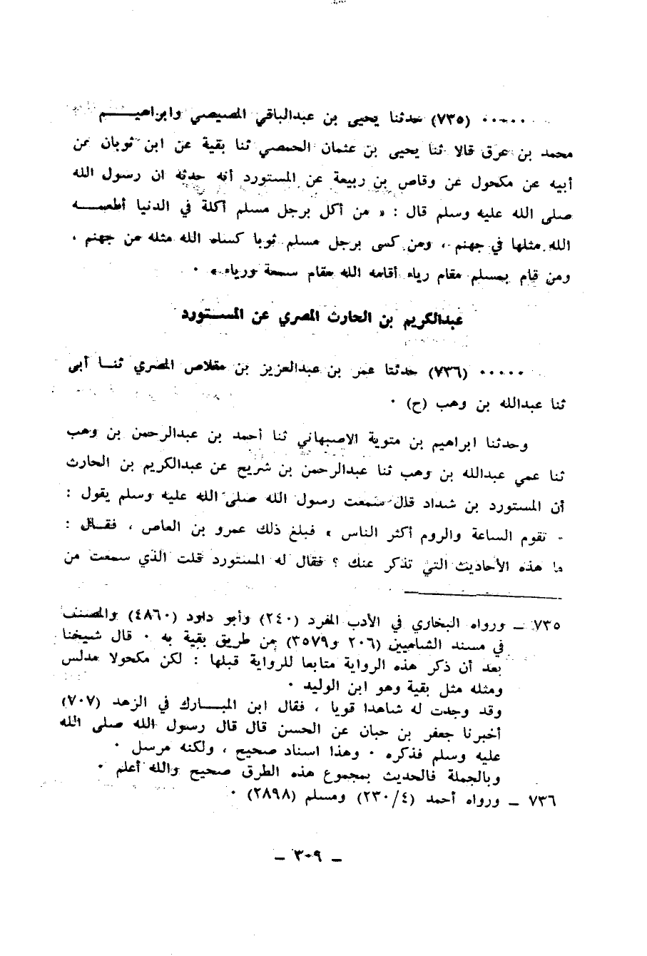 735 - حَدَّثَنَا يَحْيَى بْنُ عَبْدِ الْبَاقِي الْمِصِّيصِيُّ، وَإِبْرَاهِيمُ بْنُ مُحَمَّدِ بْنِ عِرْقٍ، قَالَا: ثنا يَحْيَى بْنُ عُثْمَانَ الْحِمْصِيُّ، ثنا بَقِيَّةُ، عَنِ ابْنِ ثَوْبَانَ، عَنْ أَبِيهِ، عَنْ مَكْحُولٍ، عَنْ وَقَّاصِ بْنِ رَبِيعَةَ، عَنِ الْمُسْتَوْرِدِ أَنَّهُ حَدَّثَهُ، أَنَّ رَسُولَ اللهِ صَلَّى اللهُ عَلَيْهِ وَسَلَّمَ قَالَ: «§مَنْ أَكَلَ بِرَجُلٍ مُسْلِمٍ أَكْلَةً فِي الدُّنْيَا، أَطْعَمَهُ اللهُ مِثْلَهَا فِي جَهَنَّمَ، وَمَنْ كُسِيَ بِرَجُلٍ مُسْلِمٍ ثَوْبًا كَسَاهُ اللهُ مِثْلَهُ مِنْ جَهَنَّمَ، وَمَنْ قَامَ بِمُسْلِمٍ مَقَامَ رِيَاءٍ أَقَامَهُ اللهُ مَقَامَ سُمْعَةٍ وَرِيَاءٍ»