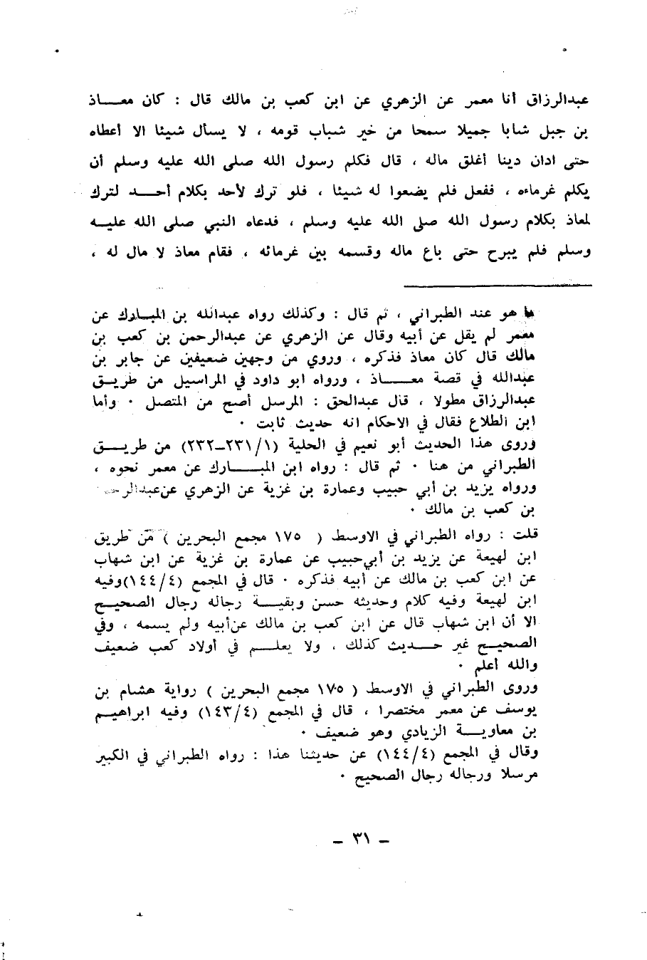 44- حَدَّثَنَا عَبْدُ اللهِ بْنُ أَحْمَدَ بْنِ حَنْبَلٍ ، حَدَّثَنِي أَبِي ، حَدَّثَنَا عَبْدُ الرَّزَّاقِ ، أَخْبَرَنَا مَعْمَرٌ ، عَنِ الزُّهْرِيِّ ، عَنِ ابْنِ كَعْبِ بْنِ مَالِكٍ قَالَ : كَانَ مُعَاذُ بْنُ جَبَلٍ شَابًّا جَمِيلاً سَمْحًا مِنْ خَيْرِ شَبَابِ قَوْمِهِ ، لاَ يُسْأَلُ شَيْئًا إِلاَّ أَعْطَاهُ ، حَتَّى ادَّانَ دَيْنًا أَغْلَقَ مَالَهُ ، قَالَ : فَكَلَّمَ رَسُولَ اللهِ صَلَّى اللَّهُ عَلَيْهِ وَسَلَّمَ أَنْ يُكَلِّمَ غُرَمَاءَهُ ، فَفَعَلَ فَلَمْ يَضَعُوا لَهُ شَيْئًا ، فَلَوْ تُرِكَ لأَحَدٍ بِكَلاَمِ أَحَدٍ لَتُرِكَ لِمُعَاذٍ بِكَلاَمِ رَسُولِ اللهِ صَلَّى اللَّهُ عَلَيْهِ وَسَلَّمَ ، فَدَعَاهُ النَّبِيُّ صَلَّى اللَّهُ عَلَيْهِ وَسَلَّمَ فَلَمْ يَبْرَحْ حَتَّى بَاعَ مَالَهُ وَقَسَّمَهُ بَيْنَ غُرَمَائِهِ ، فَقَامَ مُعَاذُ لاَ مَالَ لَهُ ، فَلَمَّا حَجَّ بَعَثَهُ النَّبِيُّ صَلَّى اللَّهُ عَلَيْهِ وَسَلَّمَ إِلَى الْيَمَنِ لِيَجْبُرَهُ قَالَ : وَكَانَ أَوَّلَ مَنْ تَجِرَ فِي هَذَا الْمَالِ مُعَاذٌ ، فَقَدِمَ عَلَى أَبِي بَكْرٍ مِنَ الْيَمَنِ وَقَدْ تُوُفِّيَ رَسُولُ اللهِ صَلَّى اللَّهُ عَلَيْهِ وَسَلَّمَ.