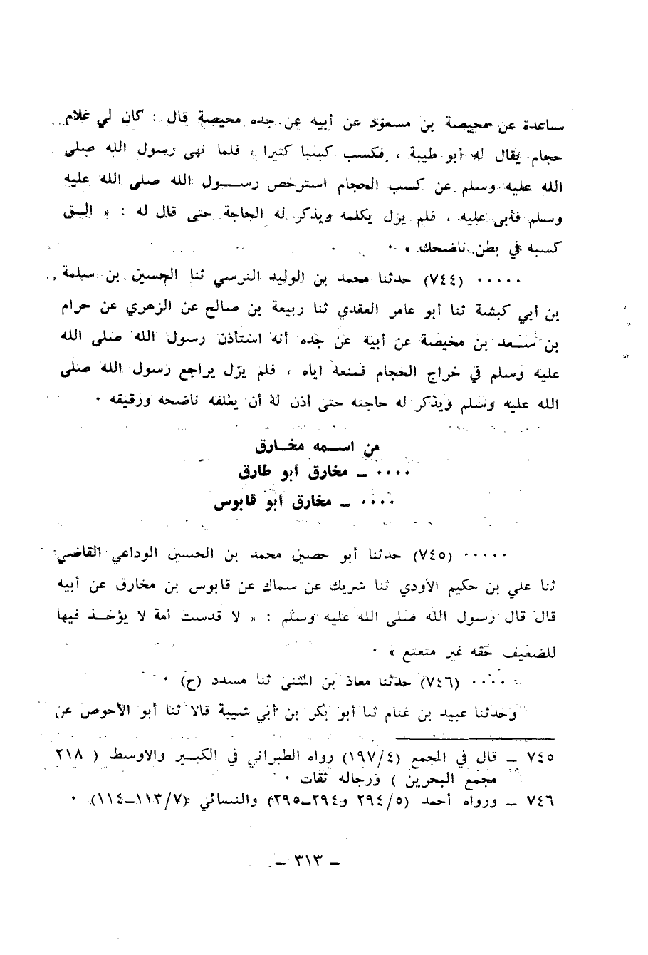 744 - حَدَّثَنَا مُحَمَّدُ بْنُ الْوَلِيدِ النَّرْسِيُّ، ثنا الْحُسَيْنُ بْنُ سَلَمَةَ بْنِ أَبِي كَبْشَةَ، ثنا أَبُو عَامِرٍ الْعَقَدِيُّ، ثنا زَمْعَةُ بْنُ صَالِحٍ، عَنِ الزُّهْرِيِّ، عَنْ حَرَامِ بْنِ سَعْدِ بْنِ مُحَيِّصَةَ، عَنْ أَبِيهِ، عَنْ جَدِّهِ، أَنَّهُ اسْتَأْذَنَ رَسُولَ اللهِ صَلَّى اللهُ عَلَيْهِ وَسَلَّمَ فِي خَرَاجِ الْحَجَّامِ «فَمَنَعَهُ إِيَّاهُ، فَلَمْ يَزَلْ يُرَاجِعُ رَسُولَ اللهِ صَلَّى اللهُ عَلَيْهِ وَسَلَّمَ وَيُذْكُرُ لَهُ حَاجَتَهُ حَتَّى» §أَذِنَ لَهُ أَنْ يَعْلِفَهَ نَاضِحَهُ وَرَقِيقَهُ "