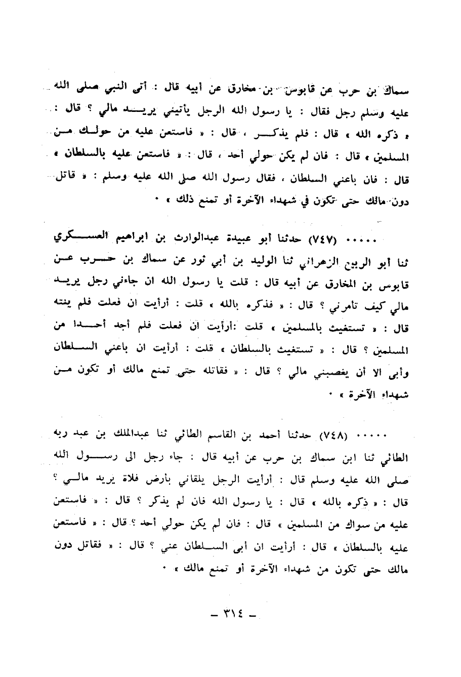 748 - حَدَّثَنَا أَحْمَدُ بْنُ الْقَاسِمِ الطَّائِيُّ، ثنا عَبْدُ الْمَلِكِ بْنُ عَبْدِ رَبِّهِ الطَّائِيُّ، ثنا ابْنُ سِمَاكِ بْنِ حَرْبٍ، عَنْ أَبِيهِ، عَنْ قَابُوسَ بْنِ مُخَارِقٍ، عَنْ أَبِيهِ، قَالَ: جَاءَ رَجُلٌ إِلَى رَسُولِ اللهِ صَلَّى اللهُ عَلَيْهِ وَسَلَّمَ قَالَ: أَرَأَيْتَ الرَّجُلَ يَلْقَانِي بِأَرْضِ فَلَاةٍ يُرِيدُ مَالِي؟ قَالَ: «ذَكِّرْهُ بِاللهِ» ، قَالَ: يَا رَسُولَ اللهِ فَإِنْ لَمْ يَذَّكَّرْ؟ قَالَ: «فَاسْتَعِنْ عَلَيْهِ مَنْ سِوَاكَ مِنَ الْمُسْلِمِينَ» ، قَالَ: فَإِنْ لَمْ يَكُنْ حَوْلِي أَحَدٌ؟ قَالَ: «فَاسْتَعِنْ عَلَيْهِ بِالسُّلْطَانِ» ، قَالَ: أَرَأَيْتَ إِنْ أَبَى السُّلْطَانُ عَنِّي؟ قَالَ: «§فَقَاتِلْ دُونَ مَالِكَ حَتَّى تَكُونَ مِنْ شُهَدَاءِ الْآخِرَةِ أَوْ تَمْنَعَ مَالَكَ»