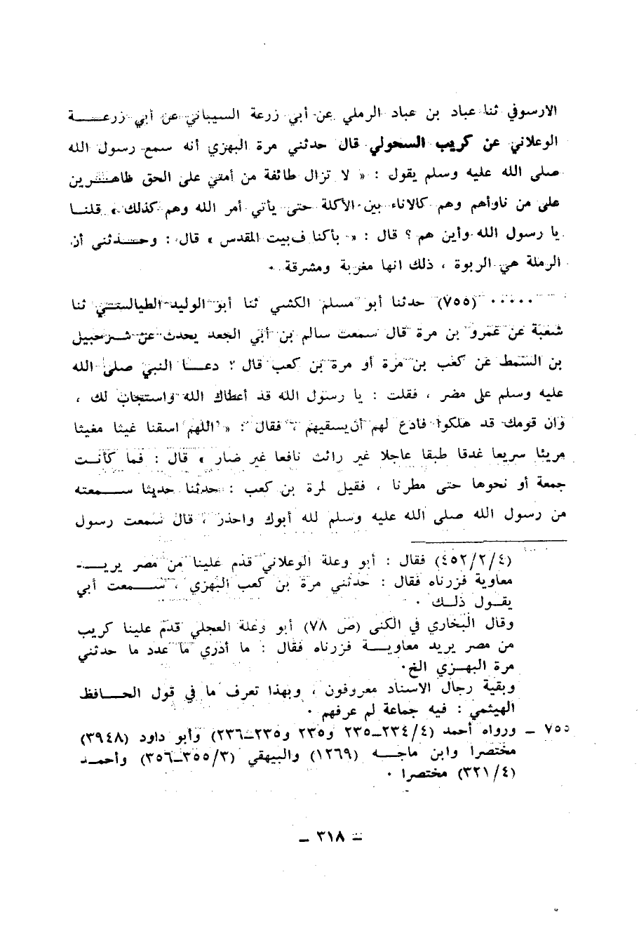 755 - حَدَّثَنَا أَبُو مُسْلِمٍ الْكَشِّيُّ، ثنا أَبُو الْوَلِيدِ الطَّيَالِسِيُّ، ثنا شُعْبَةُ، عَنْ عَمْرِو بْنِ مُرَّةَ، قَالَ: سَمِعْتُ سَالِمَ بْنَ أَبِي الْجَعْدِ يُحَدِّثُ، عَنْ شُرَحْبِيلَ بْنِ السِّمْطِ، عَنْ كَعْبِ بْنِ مُرَّةَ، أَوْ مُرَّةَ بْنِ كَعْبٍ، قَالَ: دَعَا النَّبِيُّ صَلَّى اللهُ عَلَيْهِ وَسَلَّمَ عَلَى مُضَرَ، فَقُلْتُ: يَا رَسُولَ اللهِ قَدْ أَعْطَاكَ اللهُ وَاسْتَجَابَ لَكَ، وَإِنَّ قَوْمَكَ قَدْ هَلَكُوا، فَادْعُ لَهُمْ أَنْ يَسْقِيَهُمْ، فَقَالَ: «§اللهُمَّ اسْقِنَا غَيْثًا مُغِيثًا مَرِيئًا سَرِيعًا غَدَقًا طَبَقًا عَاجِلًا غَيْرَ رَائِثٍ، نَافِعًا غَيْرَ ضَارٍّ» قَالَ: فَمَا كَانَتْ جُمُعَةٌ أَوْ نَحْوُهَا حَتَّى مُطِرْنَا