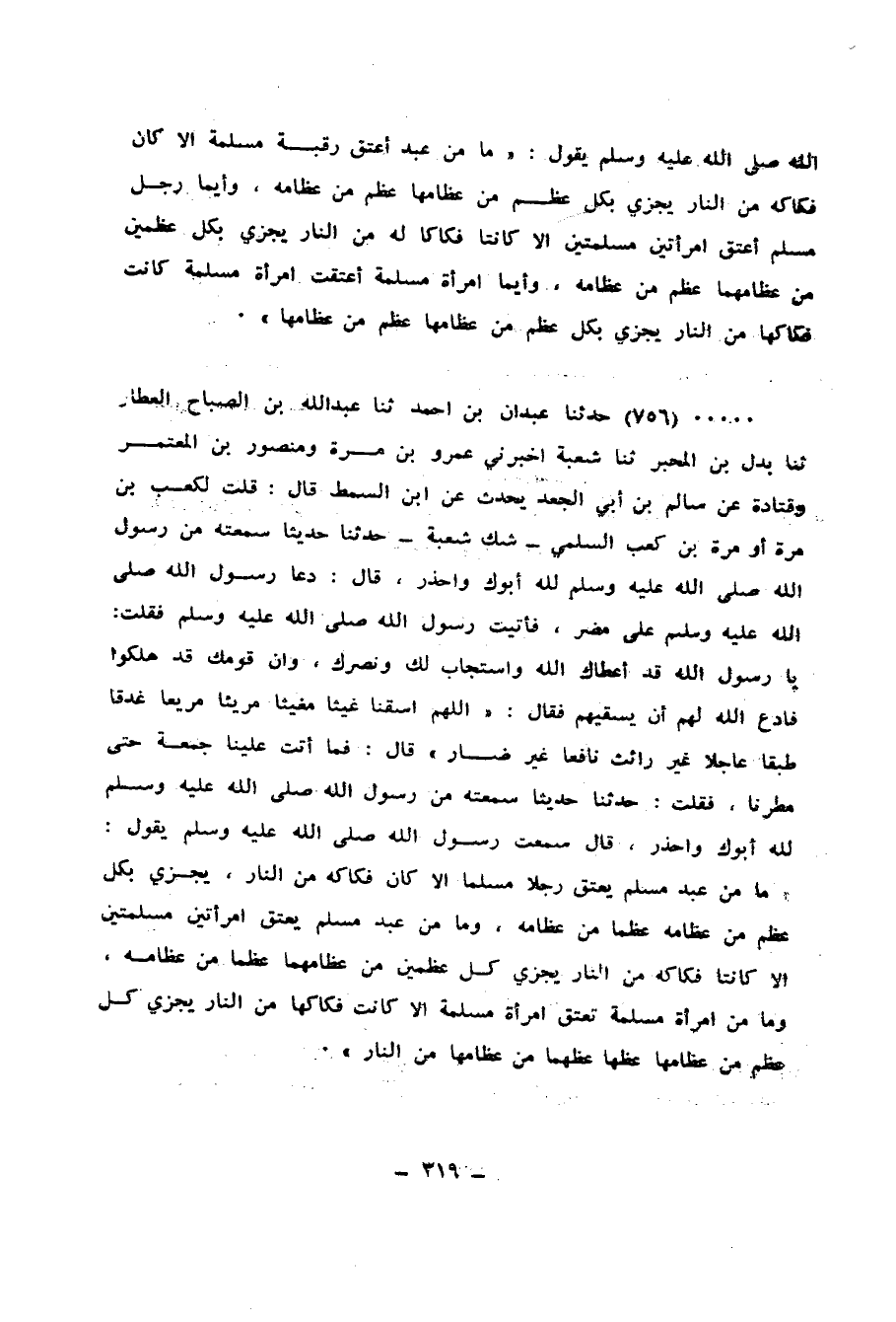 فَقُلْتُ: حَدِّثْنَا حَدِيثًا سَمِعْتَهُ مِنْ رَسُولِ اللهِ صَلَّى اللهُ عَلَيْهِ وَسَلَّمَ لِلَّهِ أَبُوكَ وَاحْذَرْ، قَالَ: سَمِعْتُ رَسُولَ اللهِ صَلَّى اللهُ عَلَيْهِ وَسَلَّمَ يَقُولُ: «§مَا مِنْ عَبْدٍ مُسْلِمٍ يُعْتِقُ رَجُلًا مُسْلِمًا إِلَّا كَانَ فَكَاكَهُ مِنَ النَّارِ، يُجْزِئُ بِكُلِّ عَظْمٍ مِنْ عِظَامِهِ عَظْمًا مِنْ عِظَامِهِ، وَمَا مِنْ عَبْدٍ مُسْلِمٍ يُعْتِقُ امْرَأَتَيْنِ مُسْلِمَتَيْنِ إِلَّا كَانَتَا فَكَاكَهُ مِنَ النَّارِ، يُجْزِئُ كُلُّ عَظْمَيْنِ مِنْ عِظَامِهِمَا عَظْمًا مِنْ عِظَامِهِ، وَمَا مِنِ امْرَأَةٍ مُسْلِمَةٍ تُعْتَقُ امْرَأَةً مُسْلِمَةً إِلَّا كَانَتْ فَكَاكَهَا مِنَ النَّارِ، يُجْزِئُ كُلُّ عَظْمٍ مِنْ عِظَامِهَا عَظْمًا مِنْ عِظَامِهَا مِنَ النَّارِ»