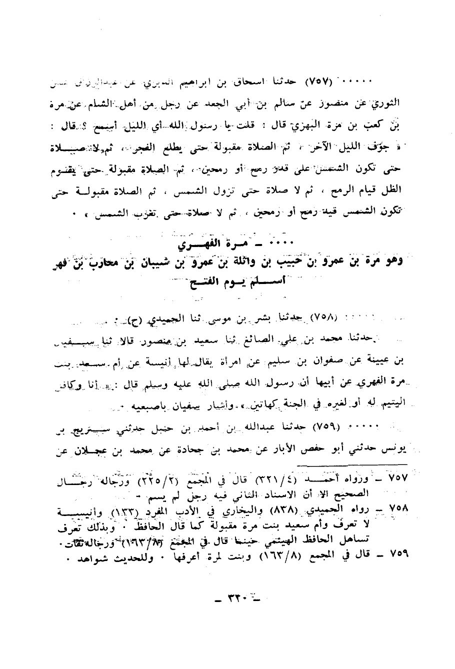 759 - حَدَّثَنَا عَبْدُ اللهِ بْنُ أَحْمَدَ بْنِ حَنْبَلٍ، حَدَّثَنِي سُرَيْجُ بْنُ يُونُسَ، حَدَّثَنِي أَبُو حَفْصٍ الْأَبَّارُ، عَنْ مُحَمَّدِ بْنِ جُحَادَةَ، عَنْ مُحَمَّدِ بْنِ عَجْلَانَ، عَنْ بِنْتِ مُرَّةَ، عَنْ أَبِيهَا، أَنَّ النَّبِيَّ صَلَّى اللهُ عَلَيْهِ وَسَلَّمَ قَالَ: «§كَافِلُ الْيَتِيمِ لَهُ أَوْ لِغَيْرِهِ إِذَا اتَّقَى مَعِي فِي الْجَنَّةِ كَهَاتَيْنِ» يَعْنِي الْمُسَبِّحَةَ وَالْوُسْطَى