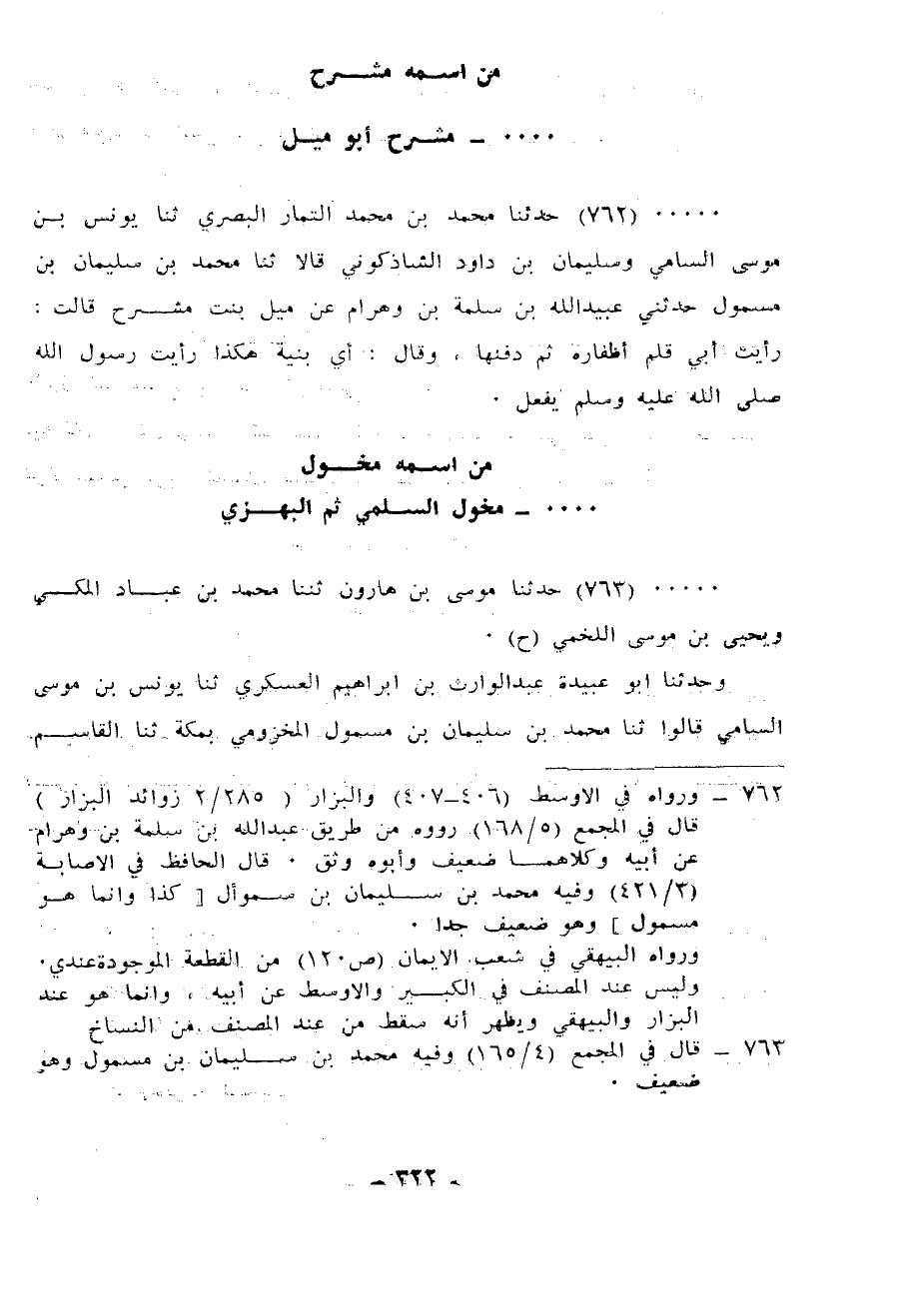 763 - حَدَّثَنَا مُوسَى بْنُ هَارُونَ، ثنا مُحَمَّدُ بْنُ عَبَّادٍ الْمَكِّيُّ، وَيَحْيَى بْنُ مُوسَى اللَّخْمِيُّ، ح وَحَدَّثَنَا أَبُو عُبَيْدَةَ عَبْدُ الْوَارِثِ بْنُ إِبْرَاهِيمَ الْعَسْكَرِيُّ، ثنا يُونُسُ بْنُ مُوسَى السَّامِيُّ، قَالُوا: ثنا مُحَمَّدُ بْنُ سُلَيْمَانَ بْنِ مَسْمُولٍ الْمَخْزُومِيُّ، بِمَكَّةَ، ثنا الْقَاسِمُ بْنُ مُخَوَّلٍ الْبَهْزِيُّ ثُمَّ السُّلَمِيُّ، قَالَ: سَمِعْتُ أَبِي يُحَدِّثُ - وَكَانَ أَدْرَكَ الْجَاهِلِيَّةَ وَالْإِسْلَامَ - قَالَ: نَصَبْتُ حَبَائِلَ لِي بِالْأَبْوَاءِ، فَوَقَعَ فِي حَبْلٍ مِنْهَا ظَبْيٌ، فانْقَلبَ الْحَبْلُ، فَخَرَجْنَا فِي أَثَرِهِ أَقْفُوهُ، فَوَجَدْتُ رَجُلًا قَدْ أَخَذَهُ فَتَنَازَعْنَا إِلَى النَّبِيِّ صَلَّى اللهُ عَلَيْهِ وَسَلَّمَ، فَوَجَدْنَاهُ نَازِلًا بِأَبْواءَ تَحْتَ شَجَرَةٍ قَدِ اسْتَظَلَّ بِنِطَعٍ، فَقَضَى بِهِ بَيْنَنَا شَطْرَيْنِ، فَقُلْتُ: يَا رَسُولَ اللهِ هَذِهِ حَبَائِلِي فِي رِجْلِهِ، قَالَ: «هُوَ ذَاكَ» ، قُلْتُ: يَا رَسُولَ اللهِ إِنَّا نَكُونُ عَلَى الْمَاءِ فَتَرِدُ عَلَيْنَا الْإِبِلُ وَهِيَ عِطَاشٌ فَنَسْقِيهَا مِنَ الْمَاءِ، هَلْ لَنَا فِي ذَلِكَ مِنْ أَجْرٍ؟ قَالَ: «نَعَمْ، §فِي» كُلِّ ذَاتِ كَبِدٍ حَرَّى أَجْرٌ "، قُلْتُ: يَا رَسُولَ اللهِ، الْإِبِلُ الطِّوَالُ تَلَقَانَا وَهِيَ مُصَرَّاةٌ وَنَحْنُ جِيَاعٌ، قَالَ: " قُلْ: يَا صَاحِبَ الْإِبِلِ، يَا صَاحِبَ الْإِبِلِ - ثَلَاثًا - فَإِنْ جَاءَ وَإِلَّا فَحُلَّ صِرَارَهَا، فَاحْلِبْ وَاشْرَبْ وَأَعِدْ صِرَارَهَا، وَبَقِّ لِلَّبَنِ دَوَاعِيهِ "
