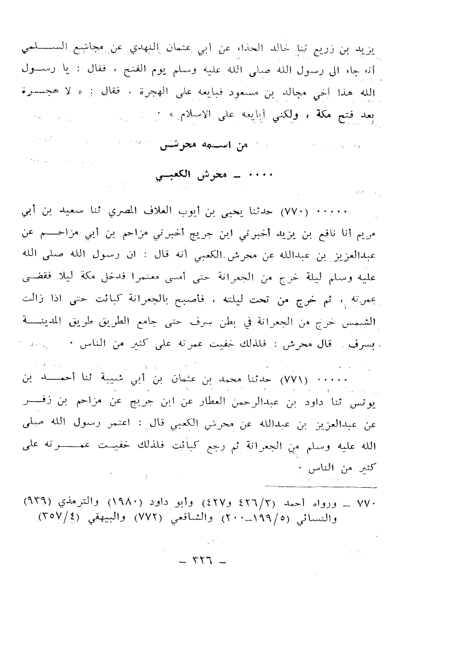 771 - حَدَّثَنَا مُحَمَّدُ بْنُ عُثْمَانَ بْنِ أَبِي شَيْبَةَ، ثنا أَحْمَدُ بْنُ يُونُسَ، ثنا دَاوُدُ بْنُ عَبْدِ الرَّحْمَنِ الْعَطَّارُ، عَنِ ابْنِ جُرَيْجٍ، عَنْ مُزَاحِمِ بْنِ زُفَرَ، عَنْ عَبْدِ الْعَزِيزِ بْنِ عَبْدِ اللهِ، عَنْ مُحَرِّشٍ الْكَعْبِيِّ قَالَ: «§اعْتَمَرَ رَسُولُ اللهِ صَلَّى اللهُ عَلَيْهِ وَسَلَّمَ مِنَ الْجِعْرَانَةِ، ثُمَّ رَجَعَ كَبَائِتٍ» ، فَلِذَلِكَ خَفِيَتْ عُمْرَتُهُ عَلَى كَثِيرٍ مِنَ النَّاسِ