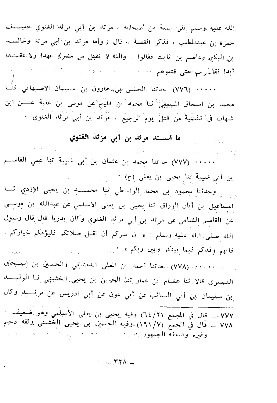 776 - حَدَّثَنَا الْحَسَنُ بْنُ هَارُونَ بْنِ سُلَيْمَانَ الْأَصْبَهَانِيُّ، ثنا مُحَمَّدُ بْنُ إِسْحَاقَ الْمُسَيَّبِيُّ، ثنا مُحَمَّدُ بْنُ فُلَيْحٍ، عَنْ مُوسَى بْنِ عُقْبَةَ، عَنِ ابْنِ شِهَابٍ، " فِي تَسْمِيَةِ مَنْ §قُتِلَ يَوْمَ الرَّجِيعِ: مَرْثَدُ بْنُ أَبِي مَرْثَدٍ الْغَنَوِيُّ "
