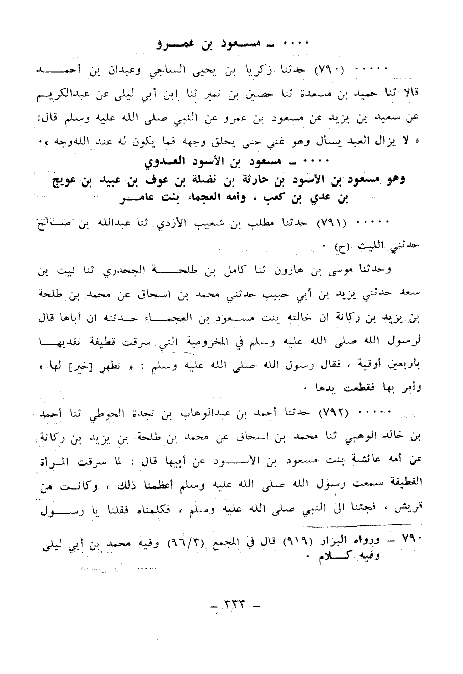 790 - حَدَّثَنَا زَكَرِيَّا بْنُ يَحْيَى السَّاجِيُّ، وَعَبْدَانُ بْنُ أَحْمَدَ، قَالَا: ثنا حُمَيْدُ بْنُ مَسْعَدَةَ، ثنا حُصَيْنُ بْنُ نُمَيْرٍ، ثنا ابْنُ أَبِي لَيْلَى، عَنْ عَبْدِ الْكَرِيمِ، عَنْ سَعِيدِ بْنِ يَزِيدَ، عَنْ مَسْعُودِ بْنِ عَمْرٍو، عَنِ النَّبِيِّ صَلَّى اللهُ عَلَيْهِ وَسَلَّمَ قَالَ: «§لَا يَزَالُ الْعَبْدُ يَسْأَلُ وَهُوَ غَنِيٌّ حَتَّى يَحْلِقَ وَجْهَهُ فَمَا يَكُونُ لَهُ عِنْدَ اللهِ وَجْهٌ»