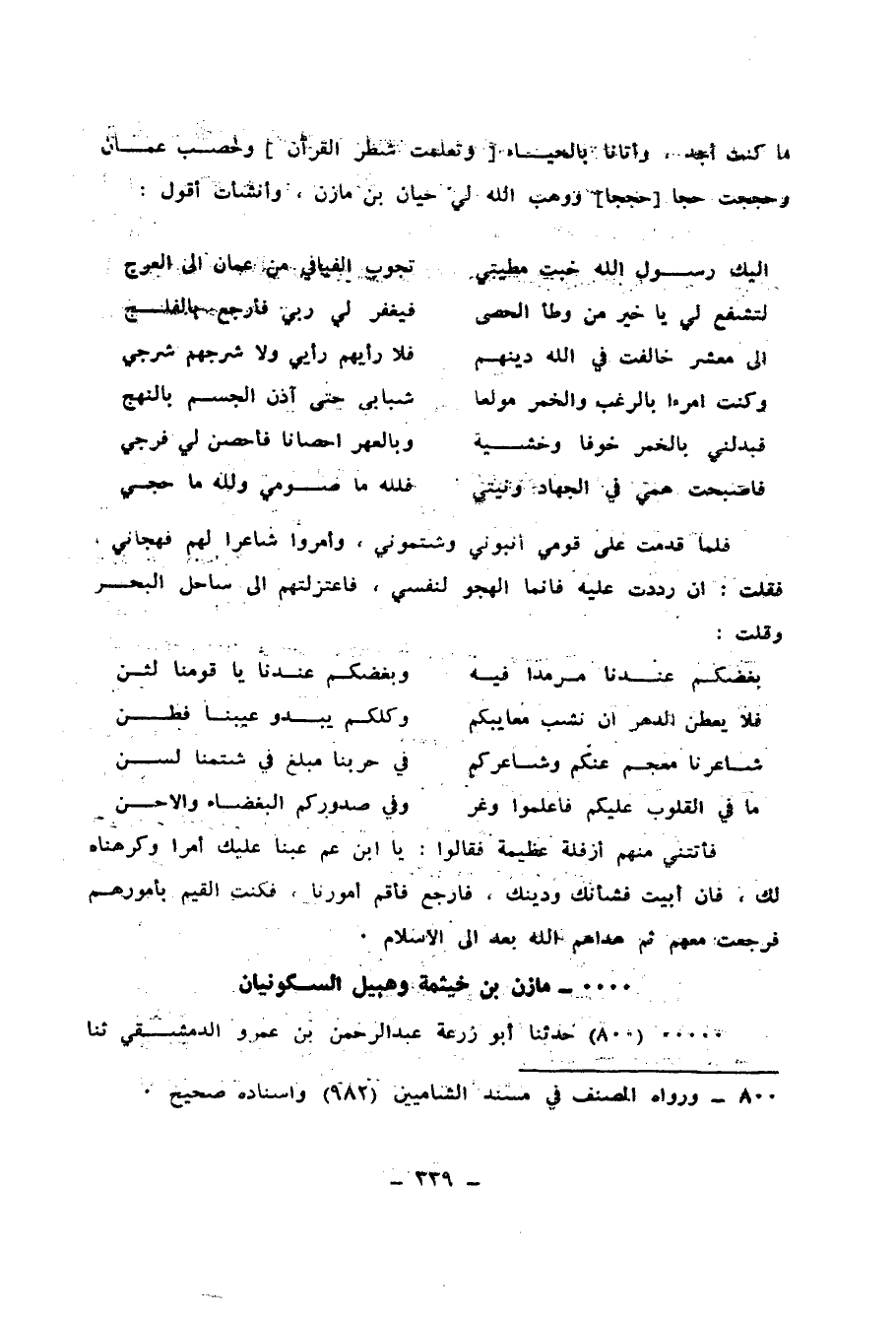 800 - حَدَّثَنَا أَبُو زُرْعَةَ عَبْدُ الرَّحْمَنِ بْنُ عَمْرٍو الدِّمَشْقِيُّ، ثنا أَبُو الْيَمَانِ الْحَكَمُ بْنُ نَافِعٍ، ثنا إِسْمَاعِيلُ بْنُ عَيَّاشٍ، عَنْ صَفْوَانَ بْنِ عَمْرٍو، عَنْ عَمْرِو بْنِ قَيْسِ بْنِ ثَوْرِ بْنِ مَازِنٍ، أَنَّ جَدَّهُ مَازِنَ بْنَ خَيْثَمَةَ، وَهَبِيلَ بْنَ كَعْبٍ - أَحَدُ بَنِي مَازِنٍ - بَعَثَهُمَا مُعَاذُ بْنُ جَبَلٍ يَوْمَ نَزَلَ بَيْنَ السَّكُونِ وَالسَّكَاسِكِ، وَقَاتَلَ حَتَّى أَسْلَمَ النَّاسُ وَافِدَيْنَ إِلَى رَسُولِ اللهِ صَلَّى اللهُ عَلَيْهِ وَسَلَّمَ، «§فآخَى بَيْنَ السَّكُونِ وَالسَّكَاسِكِ»