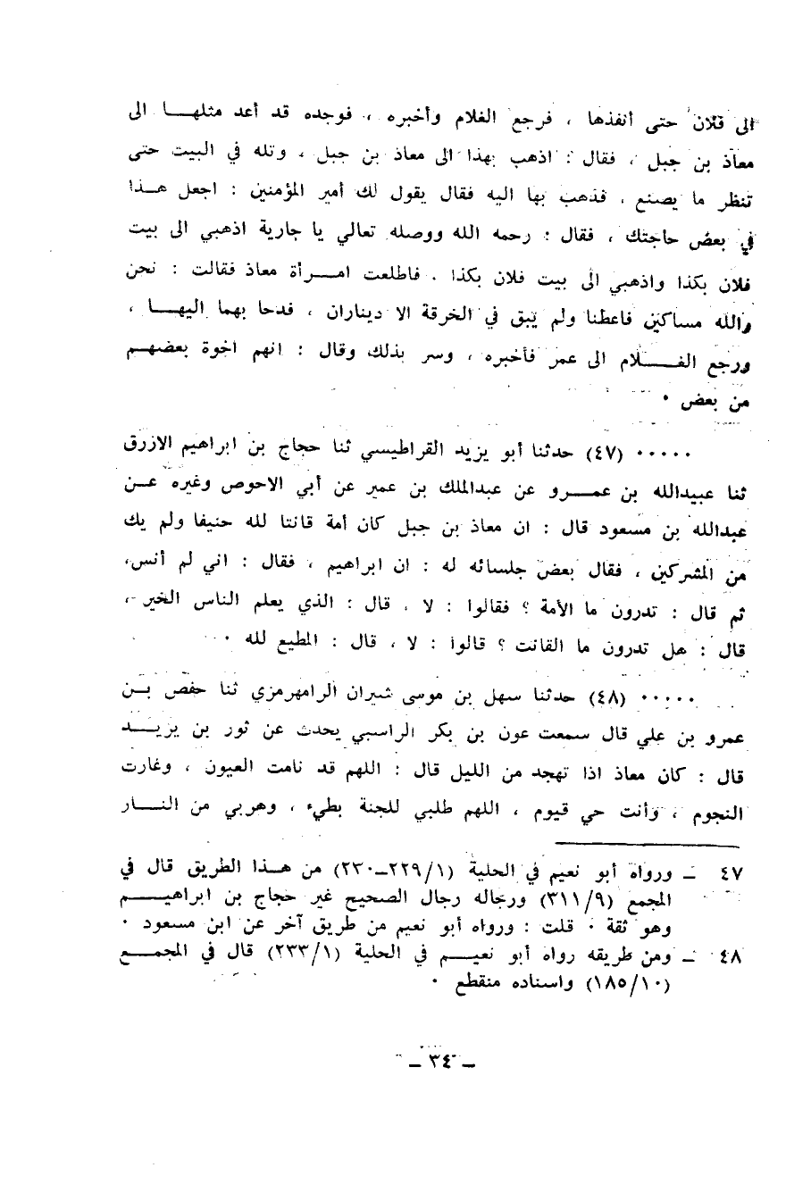 47 - حَدَّثَنَا أَبُو يَزِيدَ الْقَرَاطِيسِيُّ، ثنا حَجَّاجُ بْنُ إِبْرَاهِيمَ الْأَزْرَقُ، ثنا عُبَيْدُ اللهِ بْنُ عَمْرٍو، عَنْ عَبْدِ الْمَلِكِ بْنِ عُمَيْرٍ، عَنْ أَبِي الْأَحْوَصِ، وَغَيْرِهِ، عَنْ عَبْدِ اللهِ بْنِ مَسْعُودٍ، قَالَ: «إِنَّ §مُعَاذَ بْنَ جَبَلٍ كَانَ أُمَّةً قَانِتًا لِلَّهِ حَنِيفًا، وَلَمْ يَكُ مِنَ الْمُشْرِكِينَ» ، فَقَالَ بَعْضُ جُلَسَائِهِ لَهُ: إِنَّ إِبْرَاهِيمَ فَقَالَ: «إِنِّي لَمْ أَنَسَ» ، ثُمَّ قَالَ: «تَدْرُونَ مَا الْأُمَّةُ؟» فَقَالُوا: لَا، قَالَ: «الَّذِي يُعَلِّمُ النَّاسَ الْخَيْرَ» قَالَ: هَلْ تَدْرُونَ مَا الْقَانِتُ؟ قَالُوا: لَا، قَالَ: «الْمُطِيعُ لِلَّهِ»