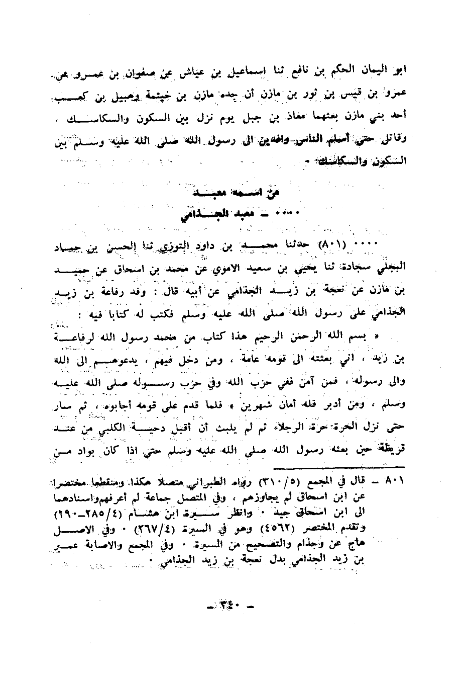801 - حَدَّثَنَا مُحَمَّدُ بْنُ دَاوُدَ التُّوزِيُّ، ثنا الْحَسَنُ بْنُ حَمَّادٍ الْبَجَلِيُّ سَجَّادَةٌ، ثنا يَحْيَى بْنُ سَعِيدٍ الْأُمَوِيُّ، عَنْ مُحَمَّدِ بْنِ إِسْحَاقَ، عَنْ حُمَيْدِ بْنِ مَازِنٍ، عَنْ نَعْجَةَ بْنِ زَيْدٍ الْجُذَامِيِّ، عَنْ أَبِيهِ قَالَ: وَفَدَ رِفَاعَةُ بْنُ زَيْدٍ عَلَى رَسُولِ اللهِ صَلَّى اللهُ عَلَيْهِ وَسَلَّمَ فَكَتَبَ لَهُ كِتَابًا فِيهِ: «§بِسْمِ اللهِ الرَّحْمَنِ الرَّحِيمِ، هَذَا كِتَابٌ مِنْ مُحَمَّدٍ رَسُولِ اللهِ لِرَفَاعَةَ بْنِ زَيْدٍ، إِنِّي بَعَثْتُهُ إِلَى قَوْمِهِ عَامَّةً وَمَنْ دَخَلَ فِيهِمْ يَدْعُوهُمْ إِلَى اللهِ وَإِلَى رَسُولِهِ، فَمَنْ آمَنَ فَفِي حِزْبِ اللهِ وَفِي حِزْبِ رَسُولِهِ صَلَّى اللهُ عَلَيْهِ وَسَلَّمَ، وَمَنْ أَدْبَرَ فَلَهُ أَمَانٌ شَهْرَيْنِ» فَلَمَّا قَدِمَ عَلَى قَوْمِهِ أَجَابُوهُ، ثُمَّ سَارَ حَتَّى نَزَلَ الْحَرَّةَ - حَرَّةَ الرَّجْلَاءِ - ثُمَّ لَمْ يَلْبَثْ أَنْ أَقْبَلَ دِحْيَةُ الْكَلْبِيُّ مِنْ عِنْدِ قُرَيْظَةَ حِينَ بَعَثَهُ رَسُولُ اللهِ صَلَّى اللهُ عَلَيْهِ وَسَلَّمَ، حَتَّى إِذَا كَانَ بِوَادٍ مِنْ أَوْدِيَتِهِمْ يُقَالُ لَهُ: شِنَانُ - وَمَعَهُ تِجَارَةٌ لَهُ أَغَارَ عَلَيْهِ الْهُنَيْدُ بْنُ عُوَيْصٍ، وَأَبُوهُ الْعُوَيْصُ الضُّبَعِيُّ - بَطْنٌ مِنْ جُذَامٍ - وَأَصَابُوا كُلَّ شَيْءٍ مَعَهُ، ثُمَّ إِنَّ نَفَرًا مِنْ قَوْمِ رِفَاعَةَ نَفَرُوا إِلَيْهِ فَأَقْبَلَ إِلَيْهِ فِيمَنْ أَقْبَلَ النُّعْمَانُ بْنُ أَبِي جِعَالٍ حَتَّى لَقَوْهُمْ فَاقْتَتَلُوا، وَرَمَى قُرَّةُ بْنُ أَشْقَرَ الضَّلَعِيُّ النُّعْمَانَ بْنَ أَبِي جِعَالٍ بِحَجَرٍ فَأَصَابَ كَعْبَهُ وَدَمَّاهُ، وَقَالَ: أَنَا ابْنُ أُثَالَةَ، ثُمَّ رَمَاهُ النُّعْمَانُ بْنُ أَبِي جِعَالٍ بِسَهْمٍ فَأَصَابَ رُكْبَتَهُ وَقَالَ: أَنَا ابْنُ إِقَالَةَ، وَقَدْ كَانَ حَسَّانُ بْنُ مِلَّةَ الضَّبِّيُّ صَحِبَ دِحْيَةَ الْكَلْبِيَّ قَبْلَ ذَلِكَ فَعَلَّمَهُ أُمَّ الْكِتَابِ، واسْتَنْقَذُوا مَا فِي أَيْدِيهِمْ فَرَدُّوهُ عَلَى دِحْيَةَ، ثُمَّ إِنَّ دِحْيَةَ قَدِمَ عَلَى النَّبِيِّ صَلَّى اللهُ عَلَيْهِ وَسَلَّمَ فَأَخْبَرَهُ خَبَرَهُمْ، واسْتَسْقَاهُ دَمَ الْهُنَيْدِ وَأَبِيهِ عُوَيْصٍ وَذَلِكَ الَّذِي هاجَ زَيْدٌ وَجُذَامُ، فَبَعَثَ رَسُولُ اللهِ صَلَّى اللهُ عَلَيْهِ وَسَلَّمَ زَيْدَ بْنَ حَارِثَةَ وَبَعَثَ مَعَهُ جَيْشًا، وَقَدْ تَوَجَّهَتْ غَطَفَانُ وَجُذَامُ وَوَائِلٌ، وَمَنْ كَانَ مِنْ سَلْمَانَ، وَسَعْدِ بْنِ هُذَيْلٍ حِينَ جَاءَهُمْ رِفَاعَةُ بِكِتَابِ النَّبِيِّ صَلَّى اللهُ عَلَيْهِ وَسَلَّمَ، فَنَزَلَ الْحَرَّةَ - حَرَّةَ الرَّجْلَاءِ - وَرِفَاعَةُ بِكُرَاعِ الْغَمِيمِ وَمَعَهُ فَارِسٌ مِنْ بَنِي الضُّبَيْبِ، وَسَائِرُ بَنِي الضُّبَيْبِ بِوَادِي مَدَارِقَ مِنْ نَاحِيَةِ الْحَرَّةِ