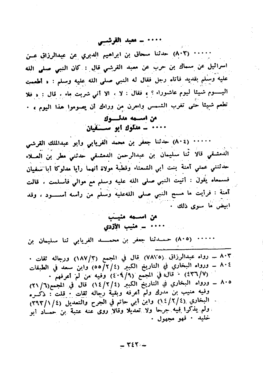 804 - حَدَّثَنَا جَعْفَرُ بْنُ مُحَمَّدٍ الْفِرْيَابِيُّ، وَأَبُو عَبْدِ الْمَلِكِ الْقُرَشِيُّ الدِّمَشْقِيُّ قَالَا: ثنا سُلَيْمَانُ بْنُ عَبْدِ الرَّحْمَنِ الدِّمَشْقِيُّ، حَدَّثَنِي مَطَرُ بْنُ الْعَلَاءِ، حَدَّثَتْنِي عَمَّتِي آمِنَةُ بِنْتُ أَبِي الشَّعْثَاءِ، وَقُطْبَةُ مَوْلَاتُهَا أَنَّهُمَا رَأَيَا مَدْلُوكًا أَبَا سُفْيَانَ فَسَمِعَاهُ، يَقُولُ: أَتَيْتُ النَّبِيَّ صَلَّى اللهُ عَلَيْهِ وَسَلَّمَ مَعَ مَوَالِيَ فَأَسْلَمْتُ، قَالَتْ آمِنَةُ: «§فَرَأَيْتُ مَا مَسَحَ النَّبِيُّ صَلَّى اللهُ عَلَيْهِ وَسَلَّمَ مِنْ رَأْسِهِ أَسْوَدَ، وَقَدِ ابْيَضَّ مَا سِوَى ذَلِكَ»